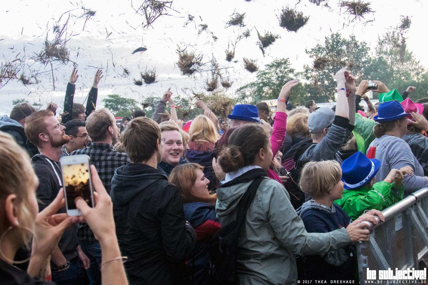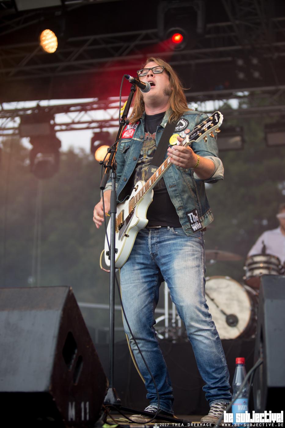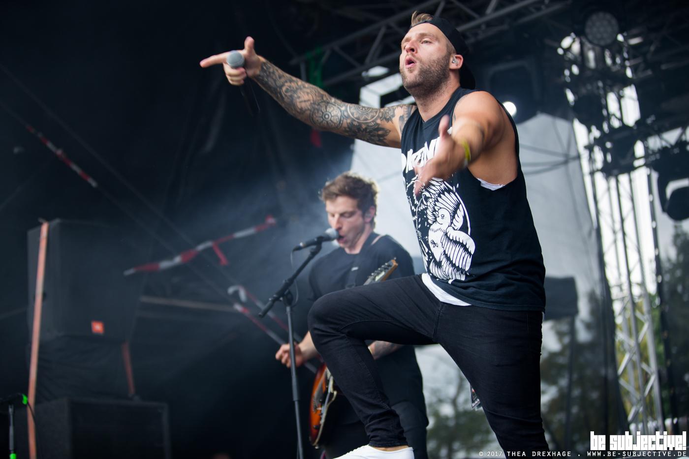 Zumindest bis es irgendwann Zeit für Massendefekt wird. Punkrock aus Meerbusch. Funktioniert. Mitsingchöre werden animiert, das mit dem hüpfen klappt auch, sorgt jedoch für den ein oder anderen mit Matsch verschmierten Hintern. Das Wetter bleibt über den Tag durchweg wechselhaft. Kaum ist mensch getrocknet kommt der nächste Regenschauer. Der Platz ist mittlerweile rappelvoll. Die Veranstaltung ausverkauft. 5000 Gäste tummeln sich vor der Bühne. Vereinzelte Crowdsurfer finden ihren Weg in den Bühnengraben, wo sie von hilfsbereiten Securities in Empfang genommen werden, welche an dieser Stelle ein großes Lob verdienen. Entspannt und wirklich gut gelaunt erledigen diese an vorderster Front einen tollen Job.