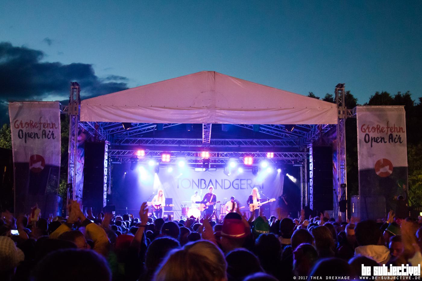 Umbaupause. Ein kurzer, heftiger Wolkenbruch ergießt sich über das Gelände. Die Gäste kuscheln sich kreisförmig unter den schützenden Dächern der Bierwagen zusammen, so wie sie es aus zahlreichen Pinguindokumentationen gelernt haben. Pünktlich zu Tonbandgerät brechen die Wolken auf. Die Stunde der Frauen schlägt. Mit Sophia Poppensieker an der Gitarre und Isa Poppensieker am Bass betreten das erste Mal an diesem Tag Musikerinnen die Bühne. Mit sauberem, deutschen Indiepop abseits von „Menschen, Leben, Tanzen, Welt“ unterhalten Tonbandgerät das Publikum und haben alle Gäste voll im Griff, so kommen tatsächlich alle 5000 Hände der netten Aufforderung nach, etwas Licht mit Handys, Feuerzeugen, Glühweinen und allem anderen was leuchtet, zu machen. Romantisch, kitschig, nett. Reicht dann aber auch wieder.