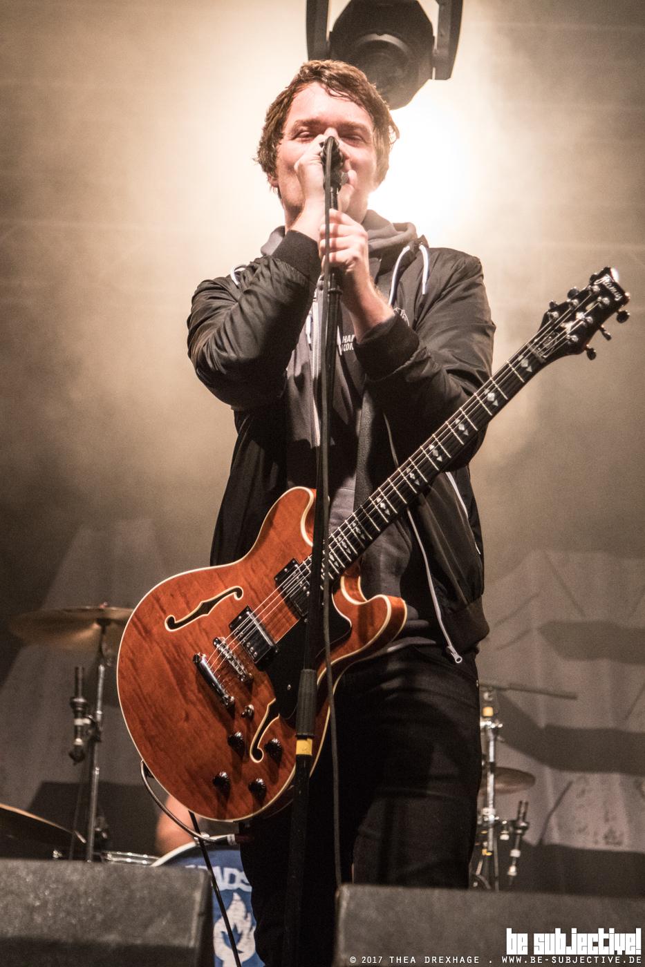 Ist mensch nach mehrmaligem Verfahren erstmal angekommen fällt die Große Parkfläche mit gut organisierten Platzanweisern direkt neben dem Veranstaltungsgelände sofort positiv auf. Am Einlass geht es entspannt zur Sache, Taschen werden kontrolliert, aber nicht verboten. Abseits der großen Metropolen mit ihren Megaevents ist die (natürlich sehr ernstzunehmende) Angst vor möglichen Gefahren in Großefehn noch nicht angekommen. Angenehm. Im Hintergrund spielen bereits Floppy Dee aus Emden ihren fröhlichen Punk Pop, um den Tag gutgelaunt einzuleiten. Sicherlich ist der Regen mit Schuld am bisherigen Gästemangel. Die Band lässt sich davon jedoch nicht groß beeindrucken und bringt ihr Set souverän mit dem Blink 182 Klassiker „All the Small Things“ zu Ende.