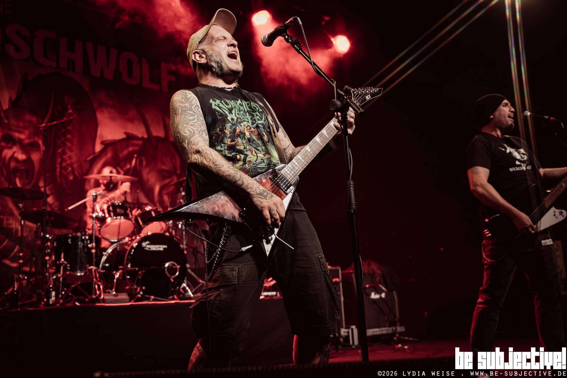 Fleischwolf eröffnen den Abend und setzen sofort auf Bewegung statt Dramaturgie. Ohne große Vorrede geht es direkt nach vorne, schneller Deutschpunk, der den Raum unmittelbar aktiviert. Nach wenigen Songs erlauben sie sich einen kleinen Stilbruch und bauen überraschend einen Metal-Song ein – inklusive Perücken auf der Bühne. Das wirkt weniger wie ein Gimmick als wie ein lockerer Türöffner. Das Publikum steigt sofort ein, die letzte Zurückhaltung ist verschwunden.