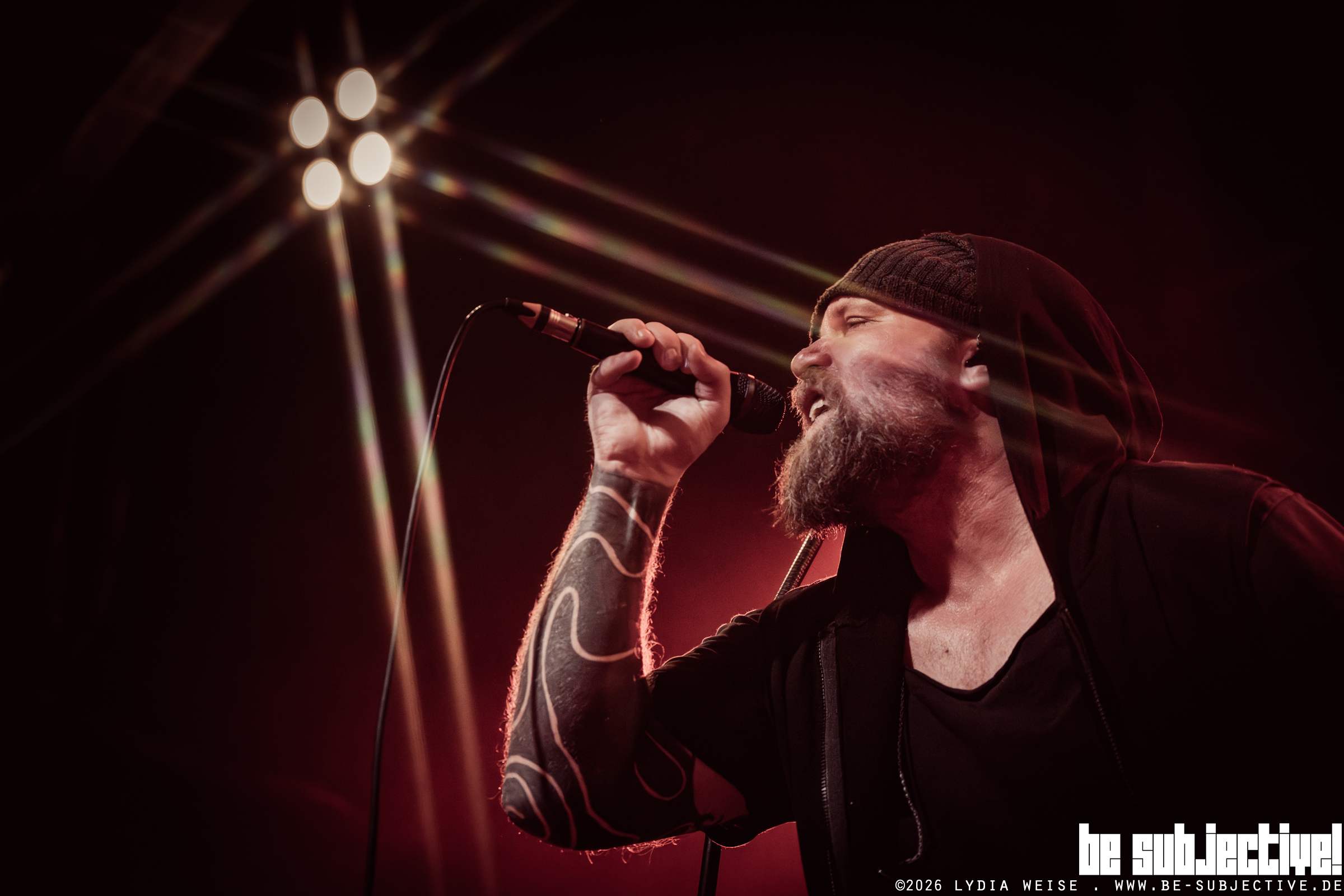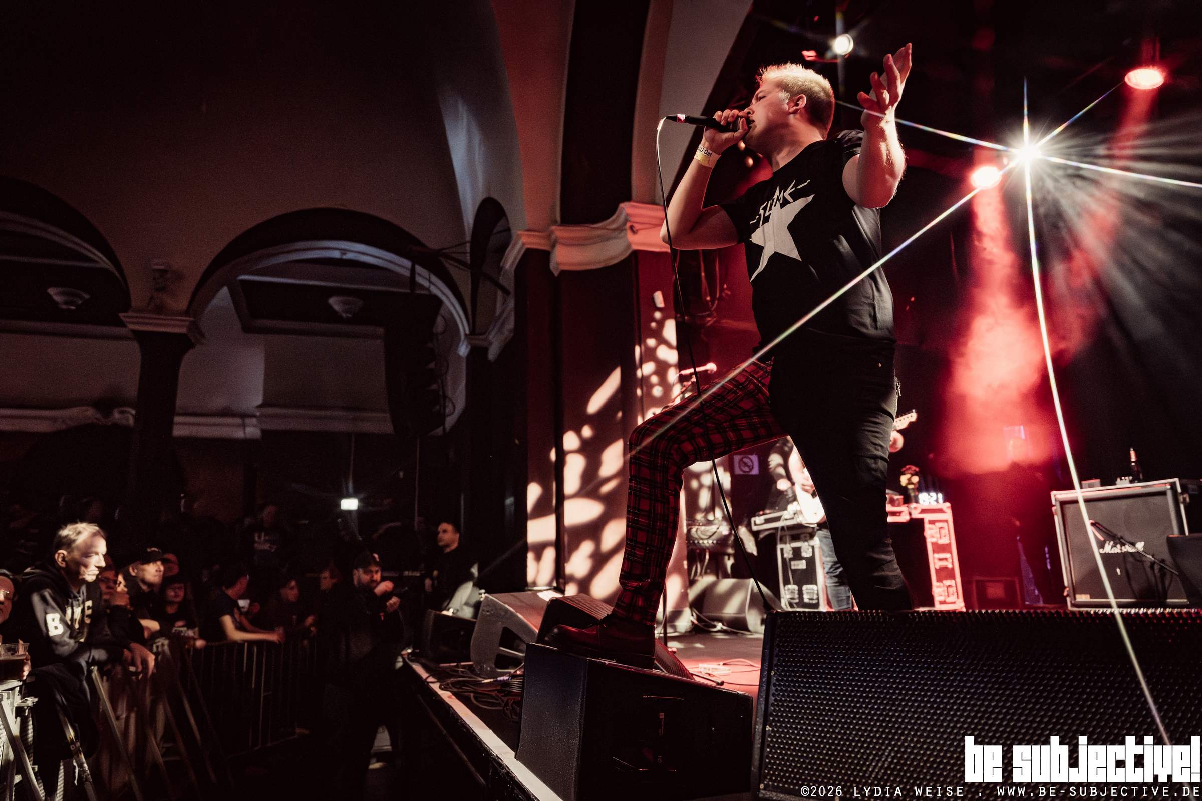 Hass drehen das Energielevel anschließend deutlich nach oben. Vom ersten Song an bewegt sich der komplette Raum, und der Sänger sucht konsequent den Kontakt nach vorne. Immer wieder hält er das Mikro ins Publikum, ganze Zeilen kommen lauter zurück als sie vorher gesungen wurden. Die Dynamik entsteht nicht aus Härte, sondern aus Beteiligung. Der Pogo bleibt intensiv, aber kontrolliert.