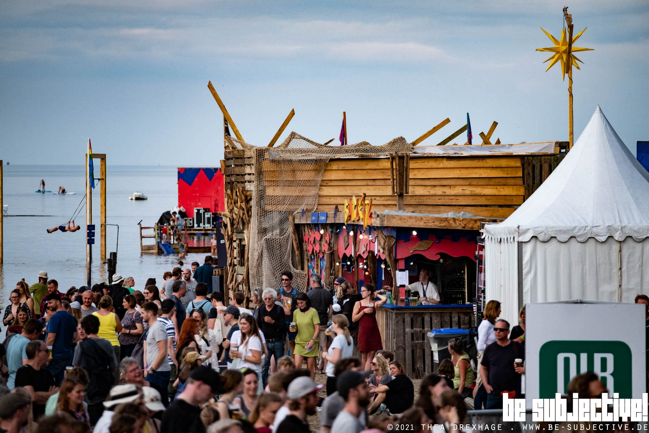 Etwas ist allerdings doch anders als in den letzten Jahren. Die Zeltbühne nennt sich nun „La Mer“ und ist umgeben von einem riesigen Holzgerüst – ohne Dach. In den kommenden Jahren soll sie noch mit einem Fischernetz bespannt werden. Dies bedeutet jedoch, dass es 2021 außer den Bierwägen keinen wirklich trockenen Unterstand für Gäste im Falle eines Wolkenbruchs geben kann – und dieser sollte nicht allzu lange auf sich warten lassen. Schon bei Annenmaykantereit, welche direkt nach Rikas den Steg zur Floßbühne erklommen haben, fing es an zu schütten. Stört aber niemanden. Aber halt, Annenmaykantereit zu so früher Zeit auf so kleiner Bühne? Klingt nach ungewöhnlichem Booking, war aber wohl der gelungenste Coup an diesem Wochenende, denn dass die spielen wusste niemand. „Secret Act“ hieß es auf dem Timetable. Trotzdem wurde es auf dem kleinen Platz vor dem Floß rappelvoll und die Spekulant*innen lagen goldrichtig. Coronaabstände? Spätestens dann vergessen, wenn Henning May mit seiner unnatürlich tiefen Stimme die liebsten Songs der Millenials schmachtet!
