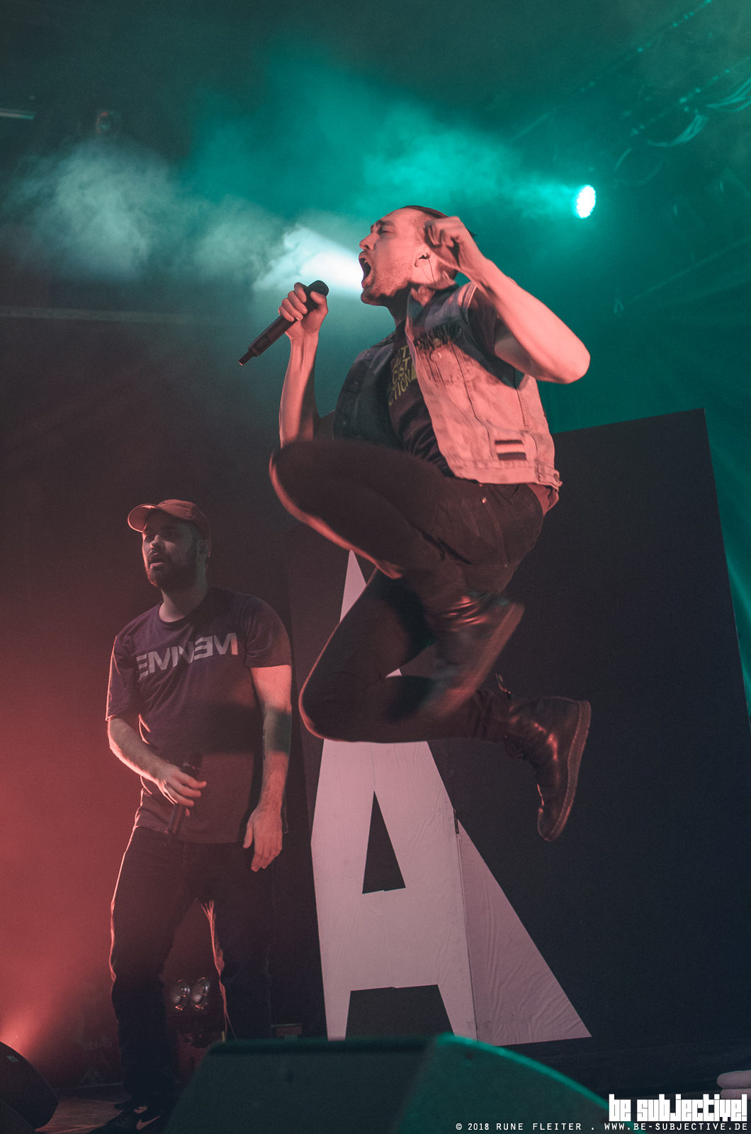 Die ersten Songs danach stehen ganz im Zeichen des Hip-Hop, mit Beats vom DJ und bei weiterhin gedämpftem Licht wird unter anderem „DIE KYNGZ SIND BACK“ gespielt. Hier geht das Publikum zum ersten Mal Steil. Bis hierhin typischer (Konzert)Alltag. Nach etwa 25 Minuten schalten die Antilopen dann einen Gang höher, jetzt ist hier Punk angesagt. Schlagzeuger, Gitarrist und Bassist kommen mit auf die Bühne, die Trennwände werden umgedreht und ein großes Backdrop sorgt jetzt für ein deutlich schönes Bühnenbild. Und auch das Licht wird jetzt weiter aufgedreht. Auf die jetzt deutlich rockigeren Songs hat das Publikum nur gewartet. Vor der Bühne herrscht jetzt richtig Bewegung, ein Pogo folgt dem nächsten und sogar eine Wall of Death wird gebildet. Zwischendrin gönnen sich die Antilopen und dem Publikum immer wieder kurze Pausen wenn sich Danger Dan an sein Piano setzt und Songs wie „Tindermatch“, „Ölsardinenindustrie“ und „Enkeltrick“ spielt. Für ein Feature holen die Antilopen dann auch noch Ihren Support Veedel Kaztro auf die Bühne.