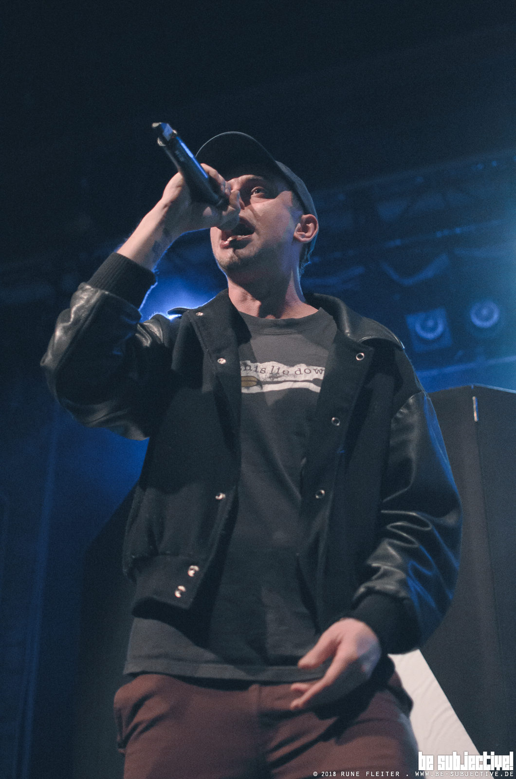 Los geht es pünktlich um 20.00 Uhr mit Veedel Kaztro, der Kölner Rapper supportet die Antilopen Gang heute zum 17. und gleichzeitig letzten Mal auf dieser Tour. An den Decks und für die Beats verantwortlich ist ein lokaler Bielefelder DJ. Während der ersten gut 20 Minuten ist das Licht nur sporadisch vorhanden, Veedel Kaztro der sich mit dunkler Hose und dunkler Jacke bekleidet und ins Gesicht gezogener Cap über die Bühne bewegt fällt so vor dem schwarzen Bühnenhintergrund kaum auf.