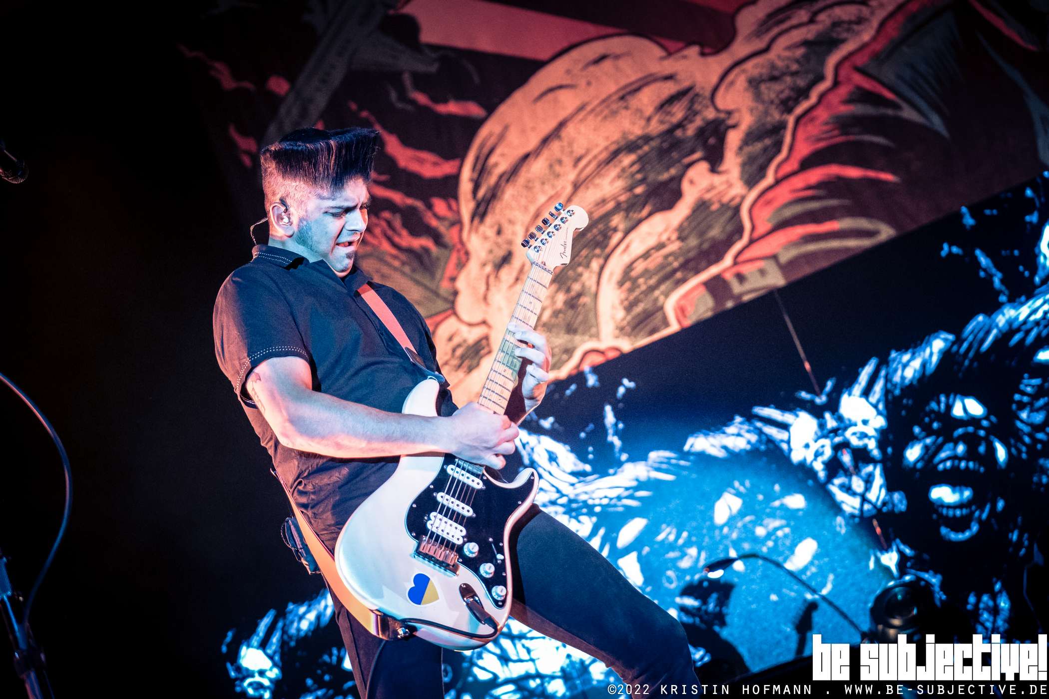 Und noch einmal schwappt ein Schwall Menschen in die Dresdner Messehalle – Es ist endlich Zeit für Billy Talent! Punkt 21.20 Uhr macht das Quartett kurzen Prozess und entert die Bühne der Messehalle in Dresden. Bereits zu Beginn gibt’s kein Halten mehr: Mit Devil In A Midnight Mass ziehen Billy Talent direkt die Zuschauergunst auf ihre Seite. Der Boden bebt, Arme werden in die Luft gerissen, Stimmbänder gedehnt. Der Moshpit läuft mit dem ersten Lied bereits auf Hochtouren, so wie die Security, die sich an diesem Abend fast keine Sekunde lang “ausruhen” kann. Ebenso zieht sich das Thema Crowdsurfing wie ein roter Faden durch den Abend. Erfreulicherweise lassen sich sehr wenig Smartphonies blicken – also Konzertbesucher, die das Konzert nur über ihr eigenes Smartphone erleben. Nach 2 Jahren Pandemie hat man wohl die Bildschirmkonzerte satt – jawoll! Das Leben findet schließlich im Hier und Jetzt statt.