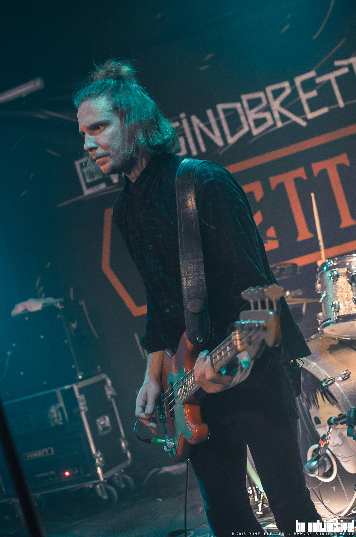 Bevor es ans Ab- und Umbauen geht werden kurz Bekannte im Publikum begrüßt, so viel Zeit muss sein. Nach nicht mal 10 Minuten ist die Bühne dann frei für BRETT, weitere fünf dauert es nochmal, bis es dann weitergeht. Das Licht geht aus und Sirenen, die an Fliegeralarm erinnern, ertönen. Langsam nehmen BRETT ihre Plätze auf der Bühne ein. Masken verdecken anfangs die Gesichter der Bandmitglieder. Diese legen sie dann aber doch recht schnell ab. Das Publikum haben BRETT dann auch relativ schnell im Griff, die Stimmung ist richtig gut, wenn auch typisch für Bielefeld, nicht sonderlich ausgelassen. Nach 45 Minuten kündigen BRETT dann schon den letzten Song an. Am Ende wird direkt Zugabe skandiert und drei weitere Songs folgen. Zuerst ein Liebeslied, nur mit Felix an der Gitarre, keine Drums und Bass. Weiter geht’s dann in voller Besetzung.