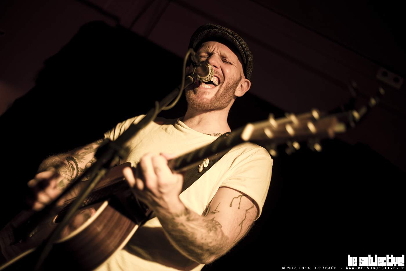 Zeilen, die dem Publikum einen kleinen Lacher entlocken können. Leider schafft Captain‘s Diary es nicht, das Publikum komplett in seinen Bann zu ziehen. Von hinten an der Bar droht lautes Gerede den Künstler zu übertönen, vor der Bühne sind die ZuhörerInnen jedoch angetan. Für sein letztes Stück „DIY until I die“ stellt sich der Captain, der mit bürgerlichem Namen Sebastian Müller heißt, ins Publikum und schafft es doch noch, den ein oder anderen Gast zum Mitsingen zu animieren. Sichtlich erleichtert verlässt Captain’s Diary nach einem recht langen Set die Bühne und übergibt das Mikro an Matze Rossi.