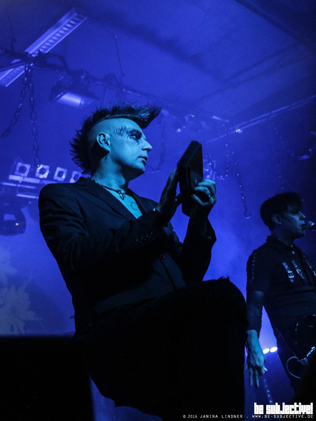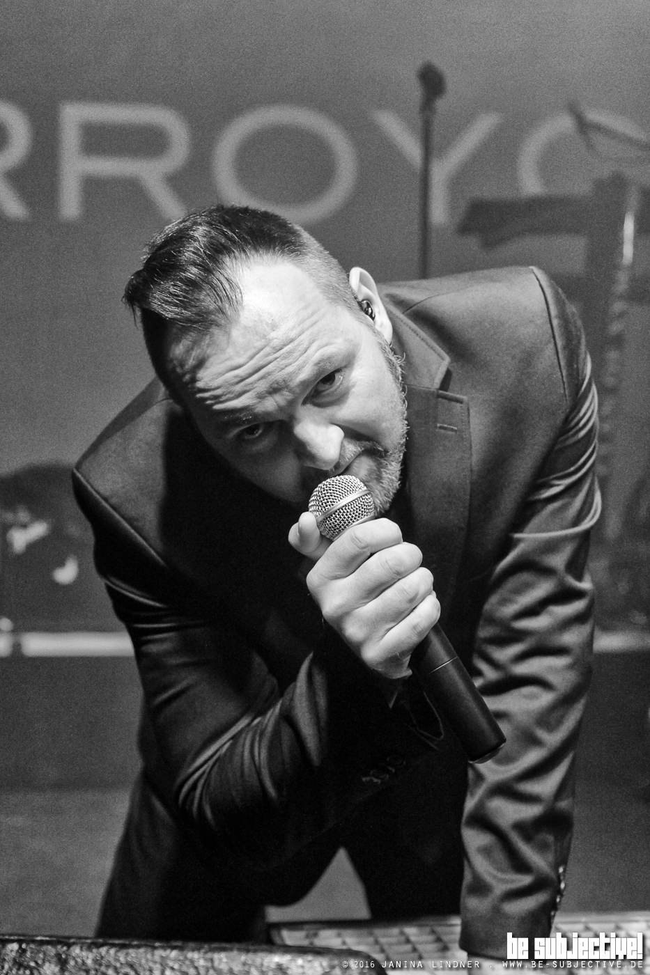 Ein Blick auf die Setlist von Rroyce zeigte, dass dies kein Supportauftritt wird, wie anfänglich vermutet. Sehr gut. Zumindest für mich. Um 21 Uhr starteten RROYCE mit den neuen Songs „The Principle of Grace“ und „Who Needs“, ihre musikalische Charmeoffensive auf das Erfurter Publikum. Leider zeigte sich schnell, dass sie es diesmal schwerer haben werden, als bei ihrem letzten Auftritt in der Thüringischen Landeshauptstadt. Geschätzt über 80 % der Anwesenden warteten offensichtlich ausschließlich auf ihre Lieblinge von Clan of Xymox. Bei Erwähnung des – erst im September veröffentlichten – neuen Albums „Karoshi“ gab es immerhin einen Kreischer im Publikum.