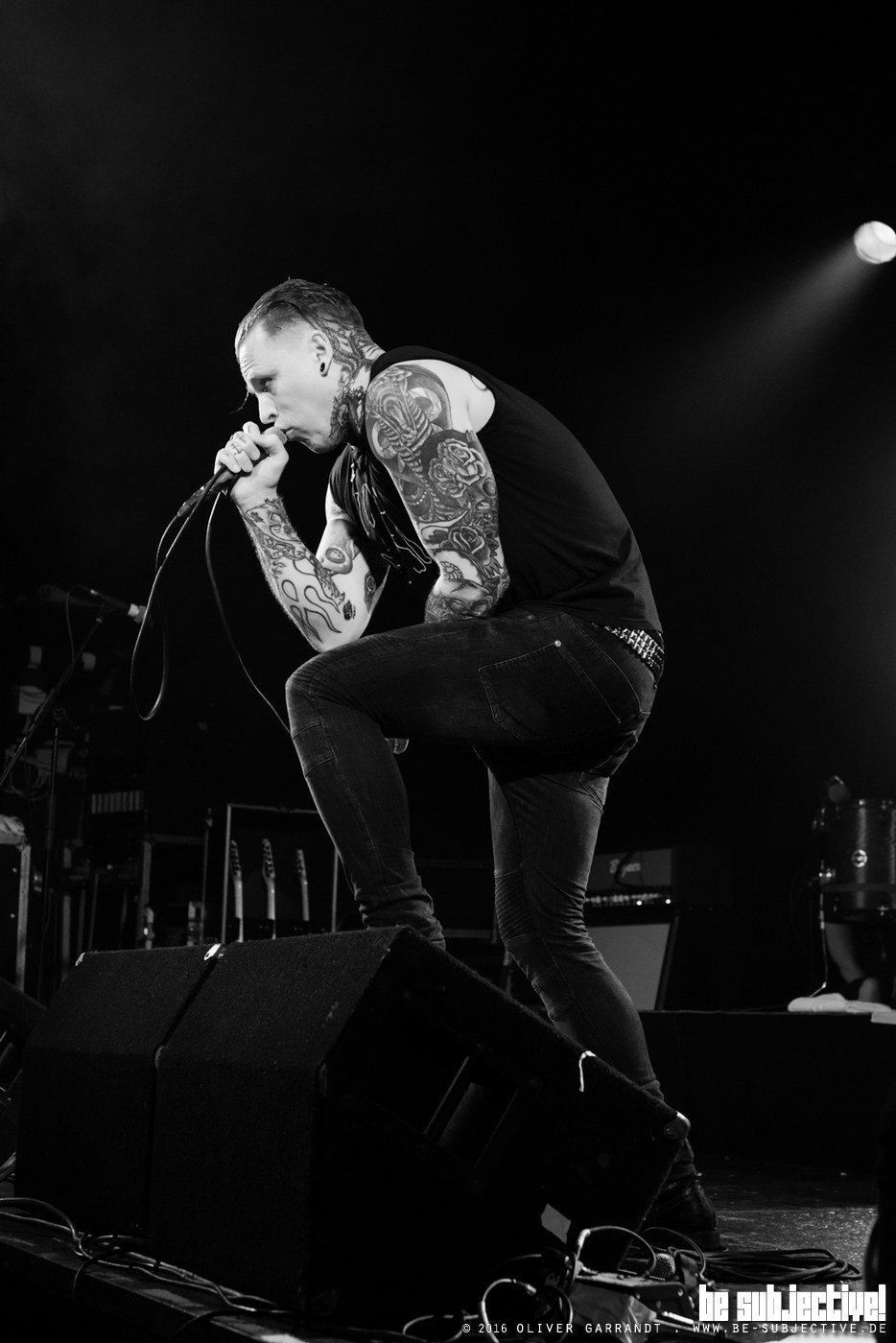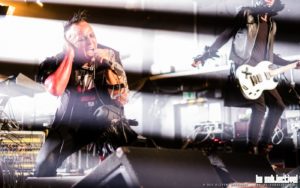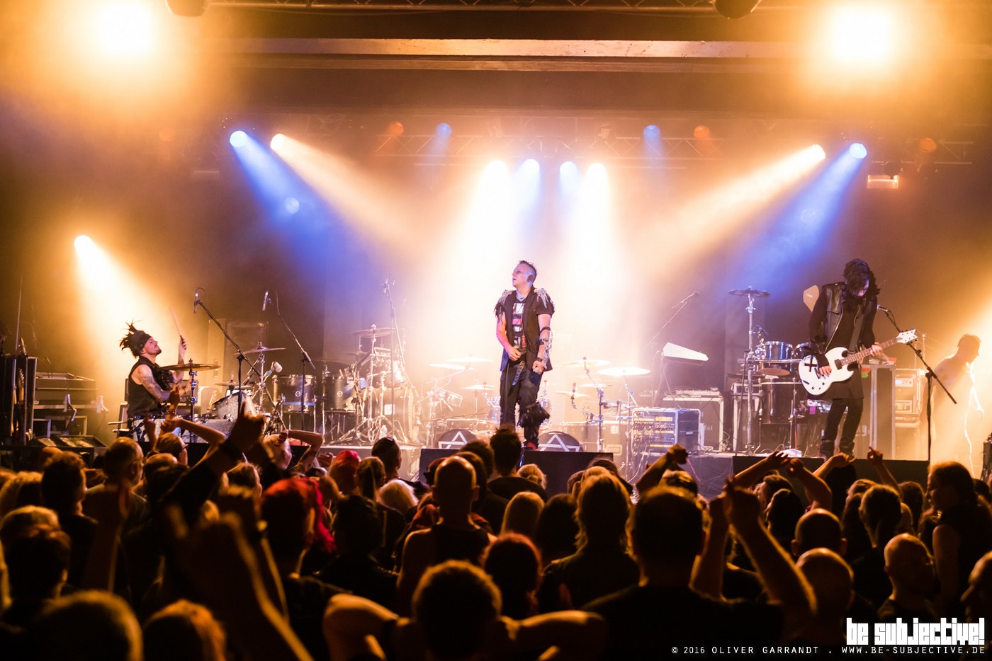 Wie so oft, wenn der Wechsel auf der Bühne vorbereitet wird, verließen einige Leute die Halle, aber leider kamen davon nicht alle, zum für mich überraschensten Gig des Abends, wieder. „Filter“! Die Band um Sänger Richard Patrick (ehemaliges Mitglied von Nine Inch Nails) ist schon fast als historisch anzusehen. Gegründet vor gut 23 Jahren hat sie zwar bisher nur sieben Alben veröffentlicht, aber zwischendurch war Richard auch mit vielen anderen Projekten beschäftigt. Das Problem des Abends war denn auch, das Filter irgendwie nicht so recht zu den anderen Bands passte. Zwar schreibt sich die Band auch den Industrial auf die Fahne, der aber eindeutig anders klingt, als es die Gäste gewohnt sind. Sehr viel rocklastiger und zumindest auch aus meiner Erfahrung heraus nicht wirklich mit viel elektronischer Unterstützung, waren viele Songs und auch Aussagen von Patrick eher politischer Natur. Ob es nun um Tötungen der Polizei ging oder eben um den republikanischen Präsidentschaftskandidaten.
