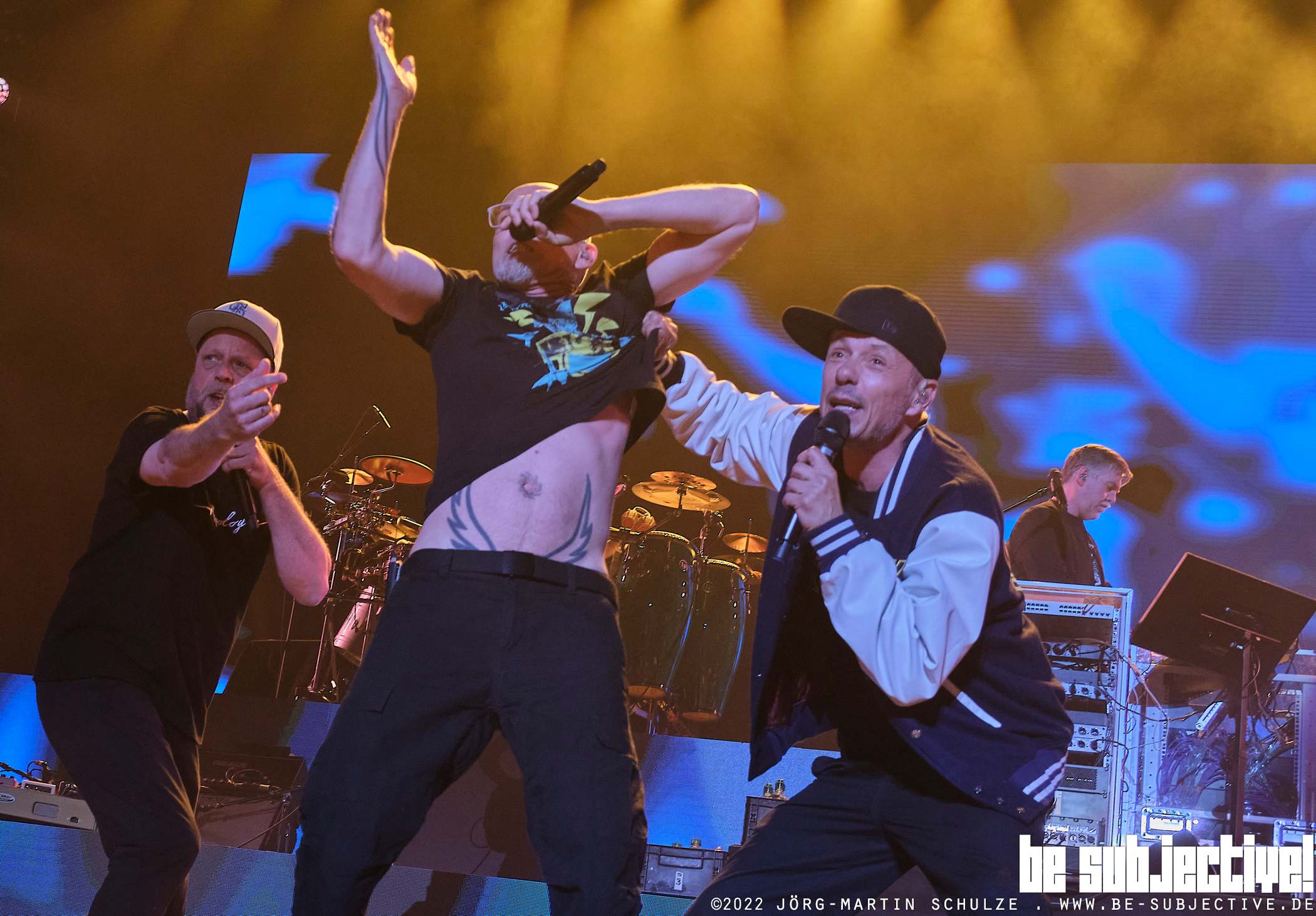 Der Fokus liegt auf Michi, Smudo und Thomas D. Voller Energie nehmen sie den vorderen Bereich der Bühne ein. And.Ypsilon ist in der Mitte der Bühne auf einem Podest an einem Mischpult. Besonders Thomas D ist ständig in Bewegung, am Herumspringen und Tanzen. Er scheint der beste Tänzer der Vier zu sein. Die Freude, endlich wieder zurück zu sein, ist bei allen dreien sichtlich groß. „Wenn hier jemand glücklich gemacht wird, sind wird das!“ Fast ohne Pause rappen sie sich einmal durch über dreißig Jahre Bandgeschichte. 30 Songs als Querschnitt aus ihren bisher 10 Alben. Es fällt auf: gerade die Fanta-Klassiker sind beliebt.