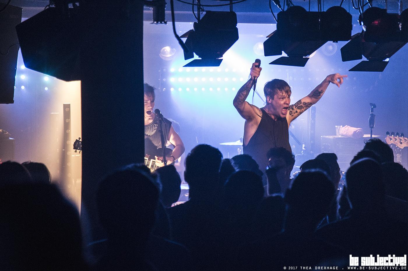 Mensch kennt die Vorurteile, mit welchen auch Disco Ensemble am Abend des 30.03.2017 im Kulturzentrum Lagerhaus nicht komplett aufräumen können. Statt einer Vorband bringen sie einen finnischen Gin-Hersteller mit auf Tournee. Ist ja irgendwie auch eine Form von Warm-Up. Statt einer freundlichen Bühnenbeleuchtung bleibt es düster, hier und da mal etwas Strobo oder Lichtblitze, um wenigstens einen kurzen Blick auf die Band werfen zu können. Seen aus Schweiß bilden sich schon nach kurzer Zeit und so wirklich fröhlich sind die Texte nun auch nicht