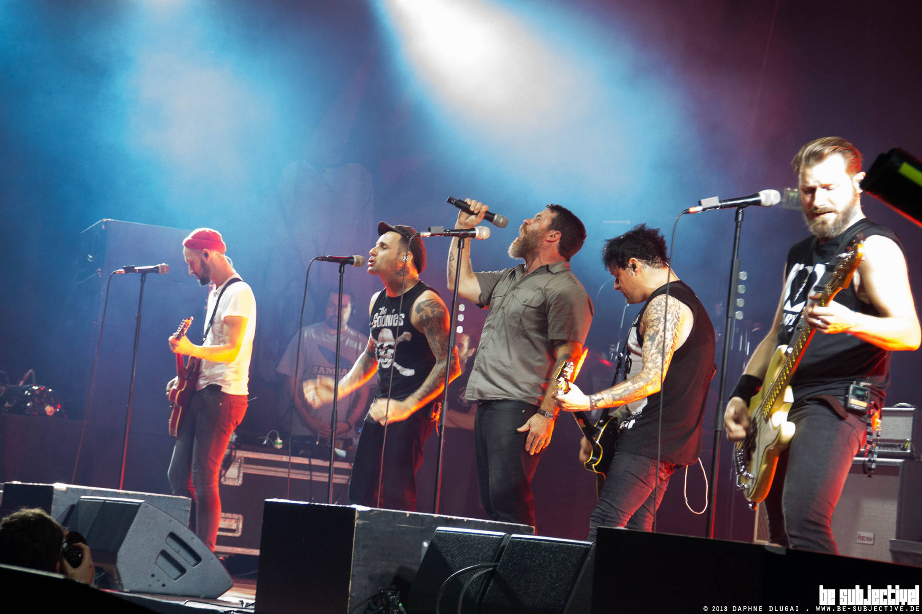 Der Vorhang fällt, die Menge grölt, Bühne frei für ein weiteres Highlight an diesem grandiosen Abend. Ingo rennt von vorne nach hinten, von rechts nach links, springt über Monitore, grüßt das Publikum, interagiert mit seinen Bandkollegen. Energie für 5 und doch stehen die anderen ihm in nichts nach. Der erste Song zeigt, wohin die Reise am heutigen Abend geht. Keine Pause, kein Erbarmen, immer weiter, jede Sekunde nutzen.