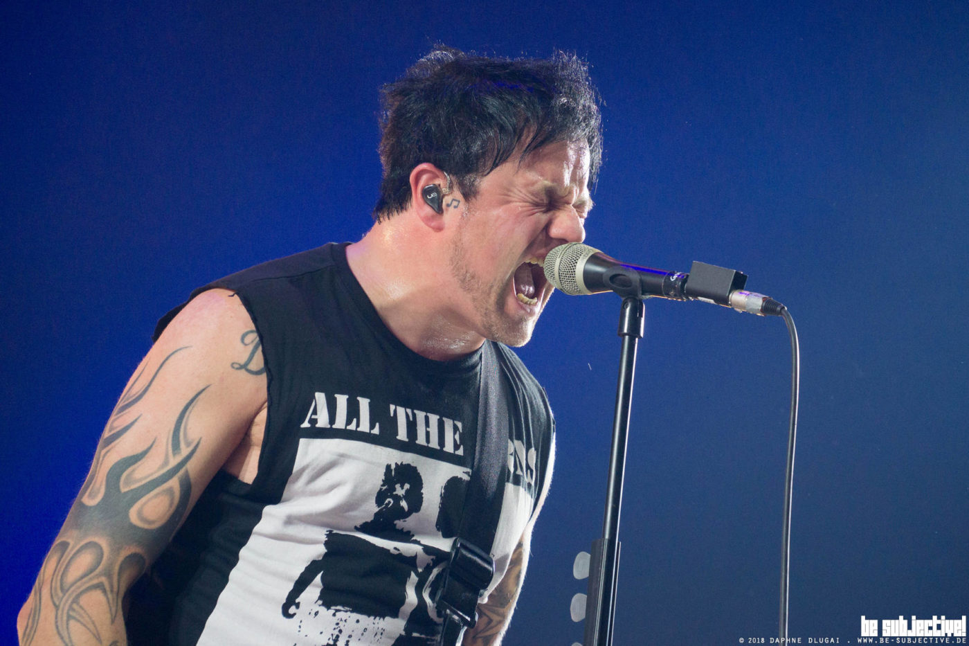 Hing vor 2 Jahren noch ein riesiges durchgestrichenes Hakenkreuz im Hintergrund der Bühne sind die Aussagen heute nicht weniger deutlich: Nazis haben hier nichts zu suchen. Alle paar Songs wechselt Ingo sein Shirt, ist das andere doch jedes Mal tropfnass geschwitzt. Nahezu jedes Outfit beinhaltet eine Botschaft: Nazis raus, Faschismus raus. Eine Botschaft, die man (leider) heutzutage nicht oft genug verbreiten kann. Das Publikum stimmt zu.
