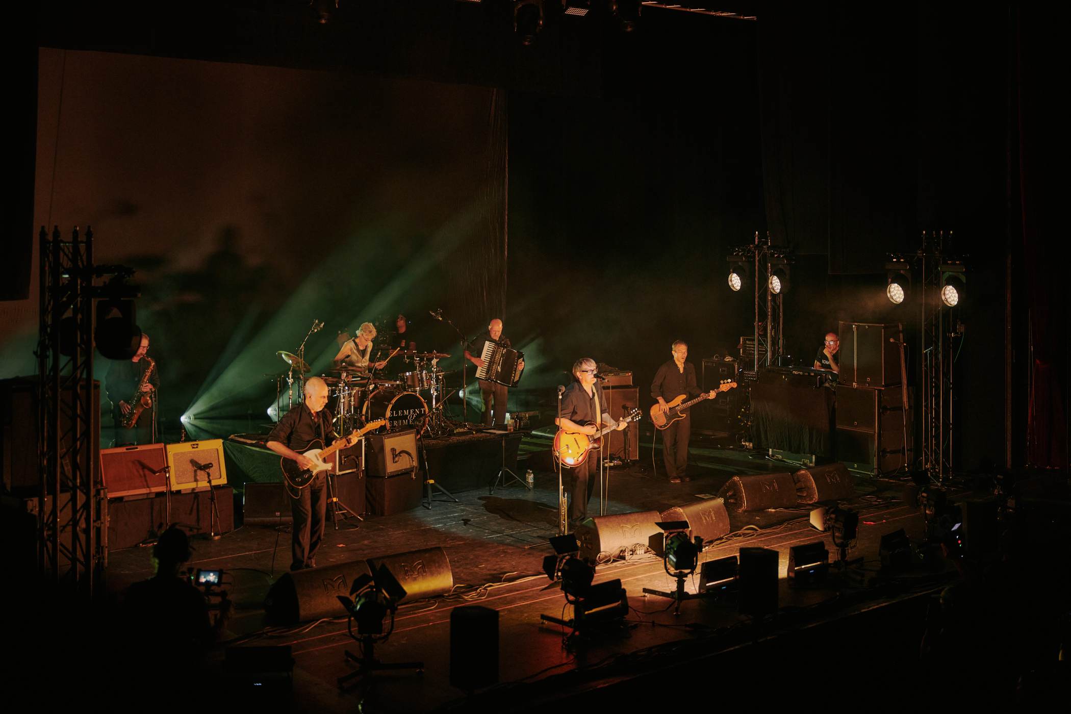 Element of Crime und der Regen. Das ist ein fest verschweißtes Paar, tief verankert in Kopf und Herz. Umso glücklicher der Umstand eines Indoorkonzerts zu Herbstbeginn in Bielefeld. Aber (regen)sicher ist hier nichts. Wenn schon nicht draußen außgiebig über sämtliche Möglichkeiten gesungen wird sich den feuchten Himmelsfreuden hinzugeben, so muss doch wenigstens der Einlass gebührend begossen werden. So oder so ähnlich die Logik des Wettergottes, der*die die geordnet auf den Einlass wartenden Zuschauer*innen kurzerhand durch den Monsun schickt.