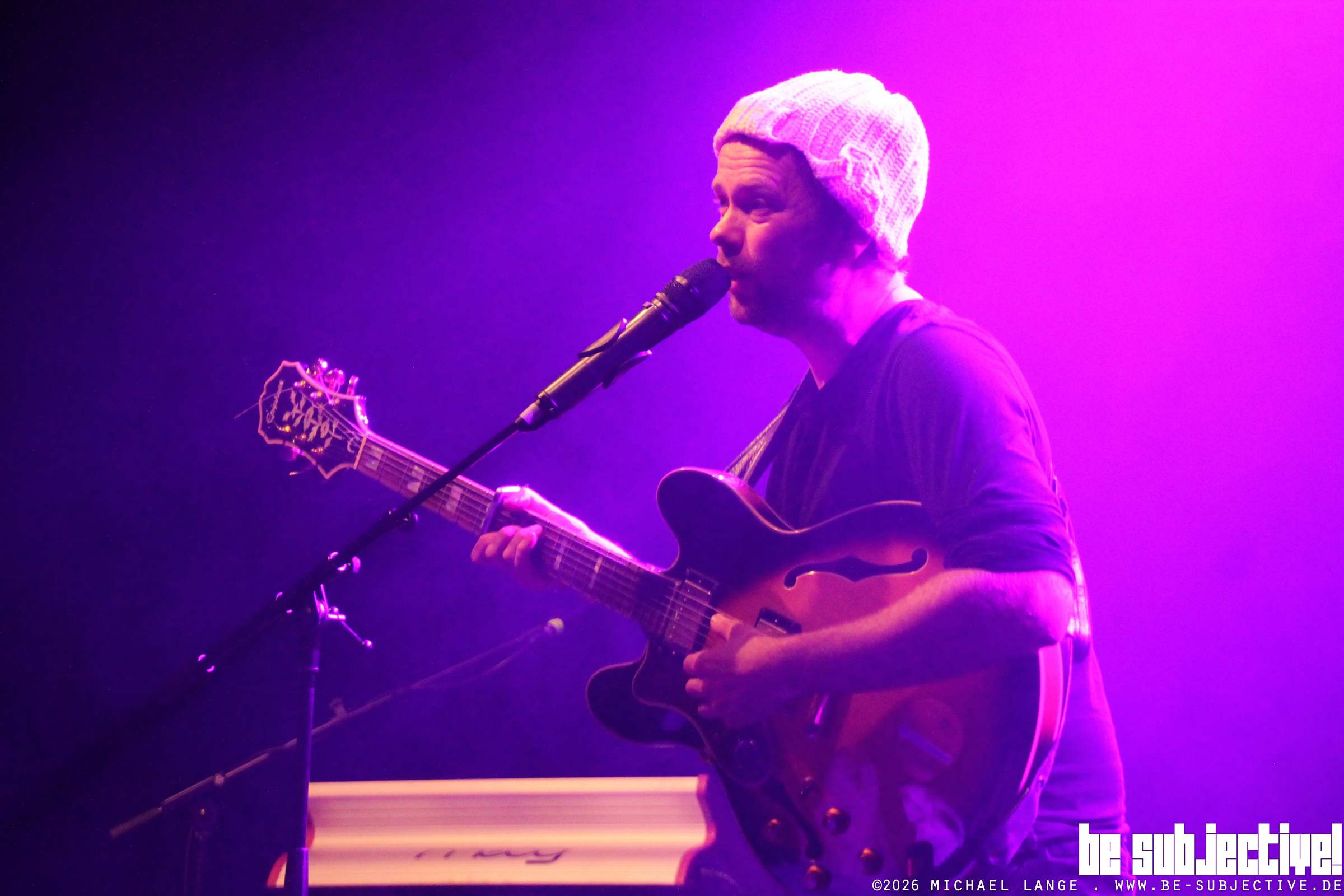 Es geht also um das Leben. Im Allgemeinen, im Besonderen, mit allen Facetten und überhaupt und sowieso. Halt typisch FE. Und nur deswegen sind die Fans hier im Pavillon Hannover. Bei Fortuna Ehrenfeld gibt es keine Vorgruppe oder Supports, sondern nur Ehrengäste. Die kündigt Martin Bechler persönlich an: Taddaa, da ist er: Bodo von Zitzewitz, als der Komparse. Der Name ist Programm. Komparse kommt aus Köln und ist allein auf der Bühne. Ein lustiger Vogel. Ich „Ich toaste meine Gedanken“ heißt das Album von ihm und darin lässt er nach eigener Aussage alles was er an Wut so in sich trägt, freien Lauf. Komparse ist ein Solo-Projekt. Indie-Geballer mit Melancholie. Mit Politikern hat er es: Er singt von Helmut Schmidt und von Ines Strack-Zimmermann, vom Beamten, der sich beamte und von „Dackel und Wale“. Immer wieder fragt er beim Publikum nach, ob es denn Fragen gäbe. Sehr gut, ist ja auch wichtig, dass man verstanden wird. Sehr witzig, der Herr von Zitzewitz.