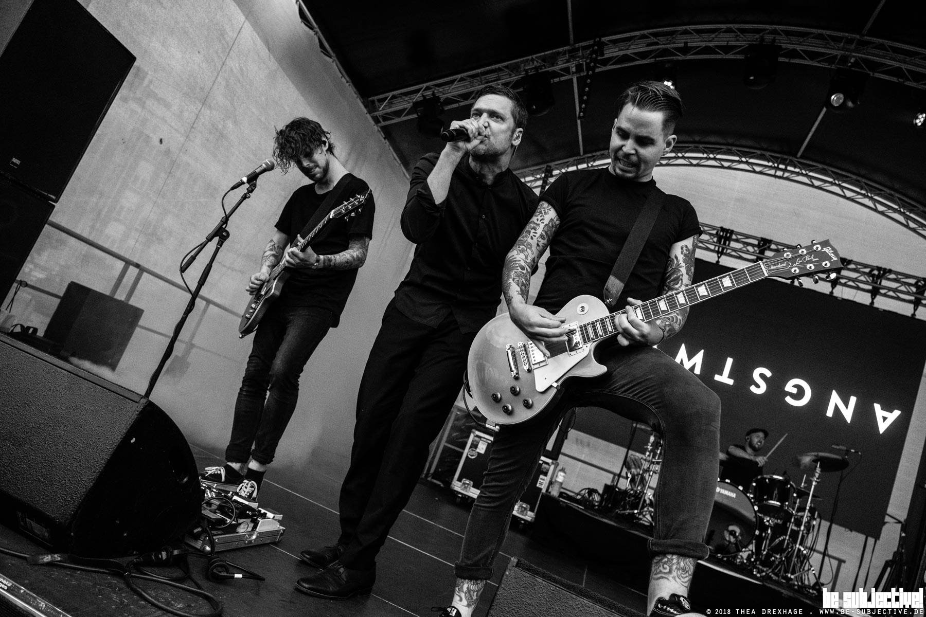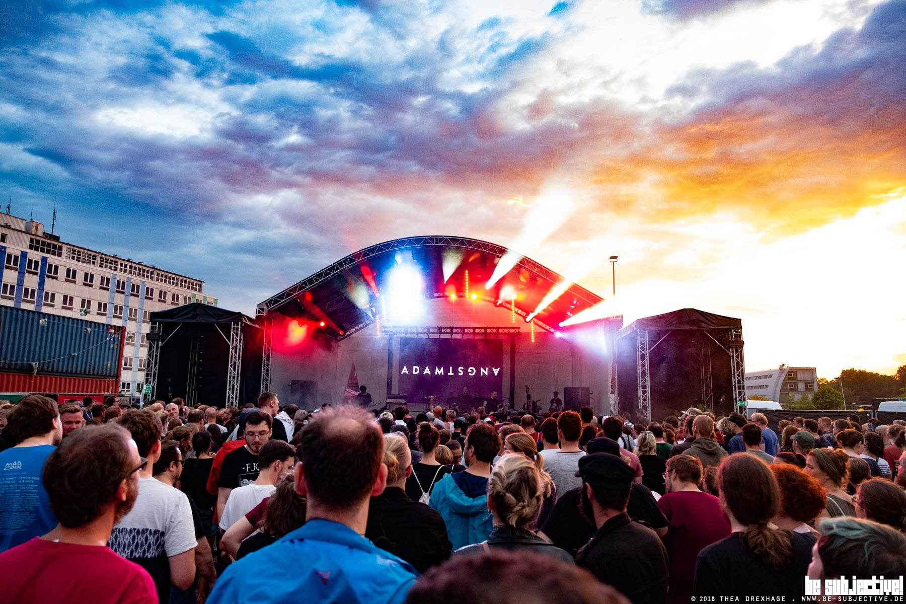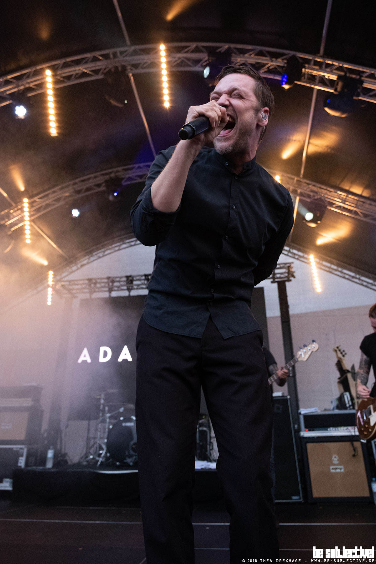 Deutlich härter und mit weniger Witz geht es im Anschluss bei Fjørt zur Sache. Das Aachner Post-Hardcore Trio hat sich, nicht zuletzt dank ihres jüngsten, stark politischen Langspielers „Couleur“ einen festen Platz in den Herzen von uns Musikliebhabern erspielt. Die Show ist energiegeladen, laut und wütend und animiert das Publikum zu wildem Kopfnicken, genau so, wie es der weise Thees Uhlmann 10 Minuten zuvor prophezeit hat. Songs mit deutlichen Botschaften wie „Paroli“ werden vom Publikum gefordert und gefeiert. Sänger und Bassist David Frings wirbelt wie wild über die Bühne und denkt gar nicht daran, Energie für seinen zweiten Auftritt mit Adam Angst zu sparen.
