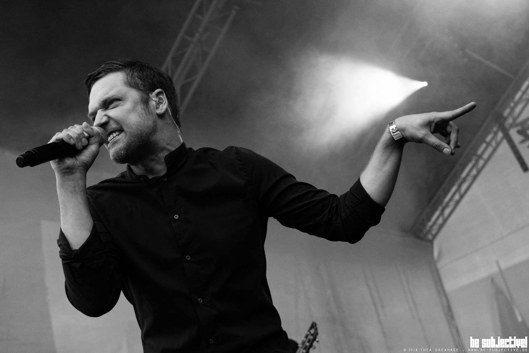 Die Zeit vergeht wie im Flug während die Sonne hinter fast schon kitschig bunten Wolken untergeht. Der gesamte 45Hertz Platz hört nicht mehr auf zu tanzen. Nach etwa einer Stunde wütendem Punkrock hat sich die Menge passend zum idyllischen Sonnenuntergang, noch etwas Liebe und Harmonie verdient, daher kehrt Schönfuss noch einmal Solo auf die Bühne zurück, um den Oasis‘ Klassiker „Don’t look back in anger“ zu performen und alle singen mit (oder versuchen es zumindest).