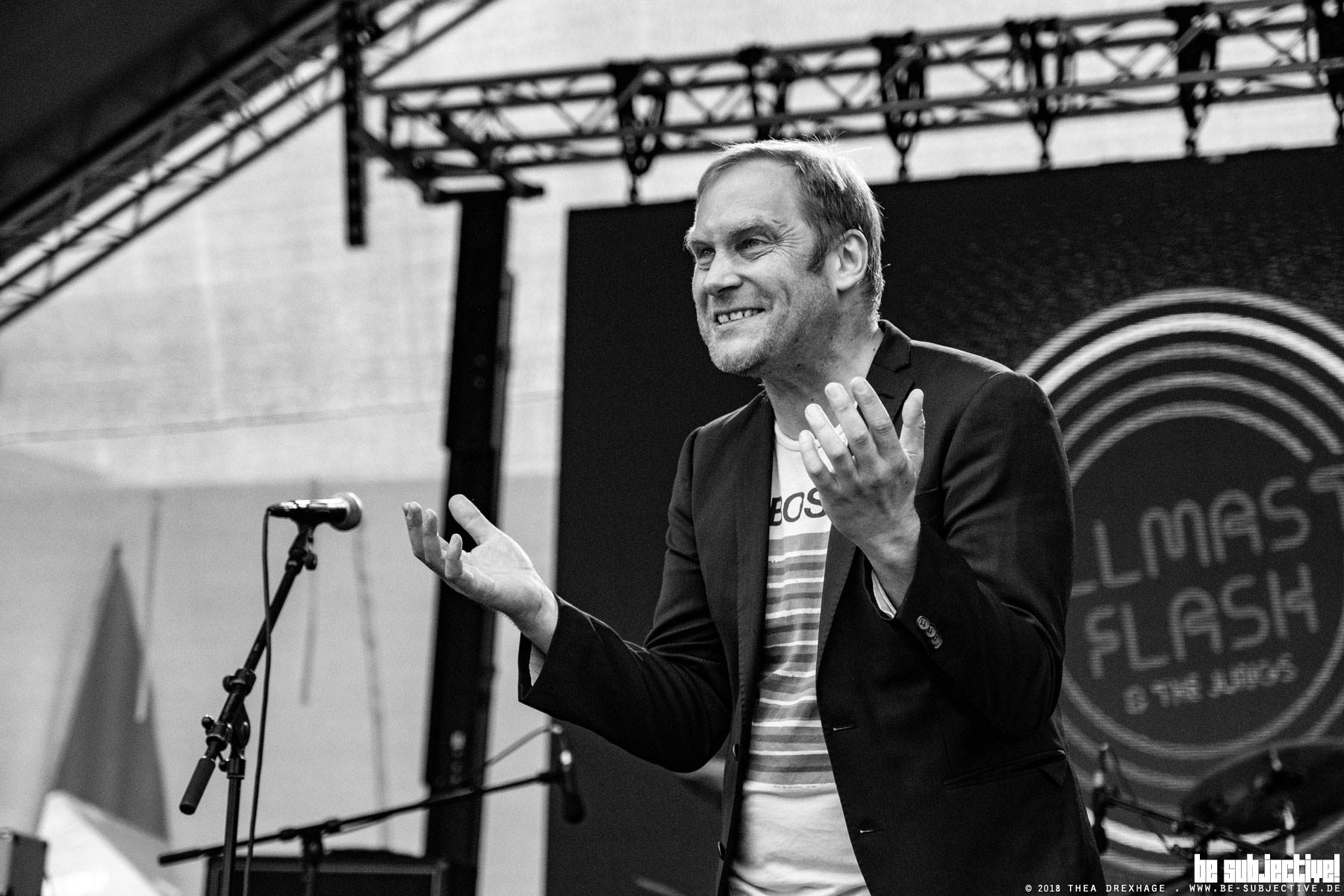 Nach er ersten kurzen Umbaupause steht der Superheld Grillmaster Flash aus Bremen Nord auf den Brettern. Statt Superheldencape gibt’s jedoch ne ordentliche Jeanskluft. Da der Sprung von Bremen Nord in die Mitte der hamburgischen Sternschanze schon einer kleinen Weltreise gleicht, die eine Menge Mut erfordert, hat er sich als emotionale Unterstützung seine Jungs eingepackt, die auch als musikalischer Support einiges her machen. So wirken die teilweise äußerst witzigen Lieder des jungen Bremers noch ausgereifter und tanzbarer, als bei seinen Solo Shows. Die Beine der Gäste wackeln, die Witze der Musiker zünden, alles in allem fügen sich Grillmaster Flash & the Jungs bestens in das Programm des hamburgischen Labels ein.