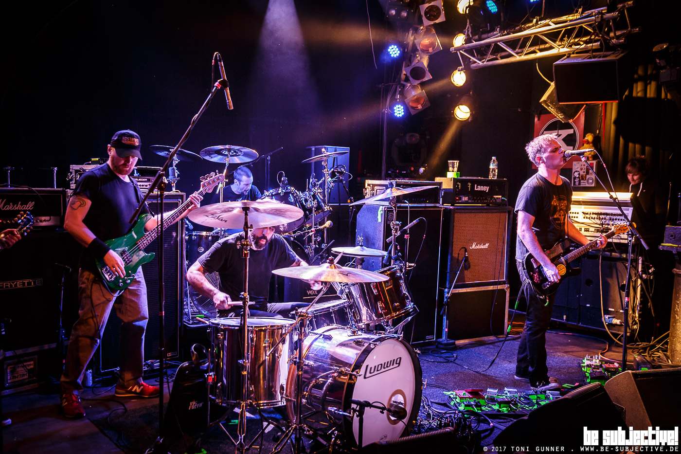 Die Songs werden recht lieblos runtergespielt, es wird sich kaum bewegt und so verwundert es auch nicht wirklich, dass das Hamburger Publikum das tut, was ihm gerne immer wieder nachgesagt wird: nordische Zurückhaltung. Es gibt schon zwei handvoll Menschen, die sich sichtbar freuen und sich bewegen, der Rest guckt aber recht stoisch zu. Erst nach der Hälfte des Sets wird es besser, und in dem Moment, wo Helmet aus seiner Lethargie erwachen, zieht auch das Hamburger Publikum mit und spendet Applaus.