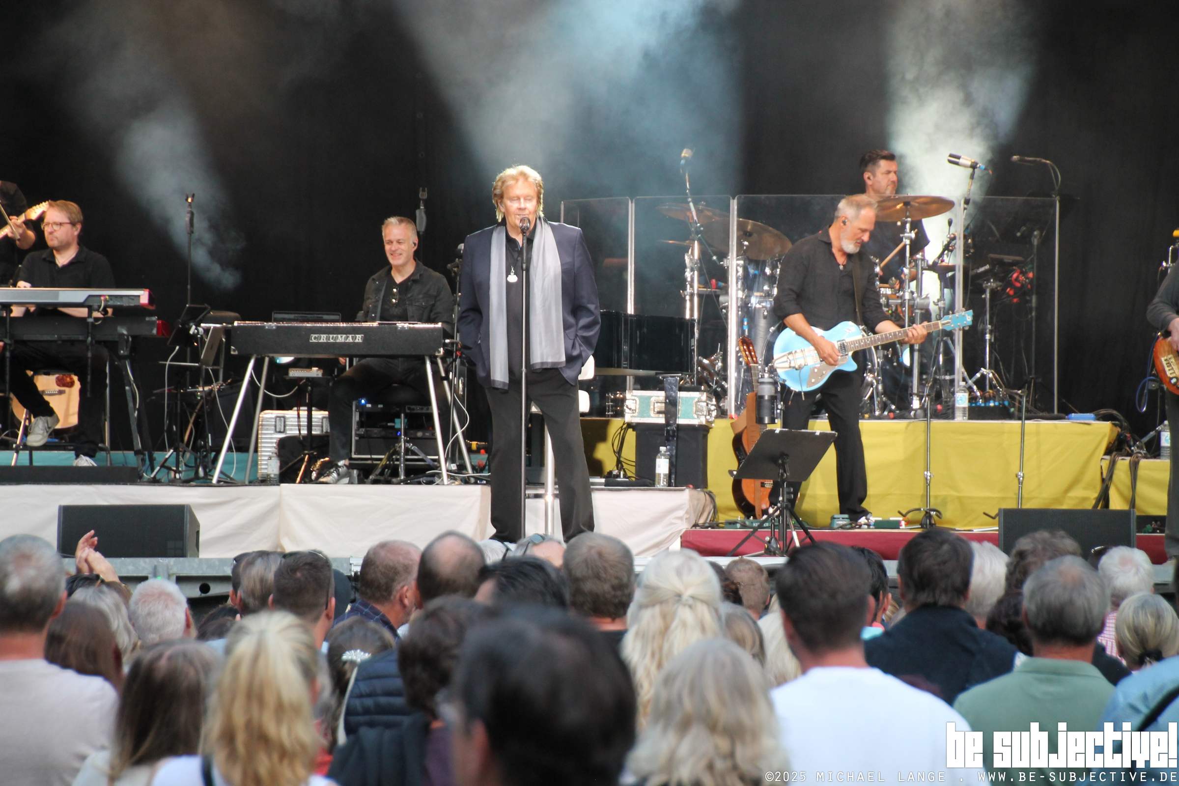 Nach einem Intro seiner Band betritt er die Bühne. Endlich in Northeim, wo er noch nie gespielt hat. Sagen tut er zunächst nichts, aber wenn man genau hinschaut, entlockt es ihm beim Blick in das weite Rund der Waldbühne Northeim ein Wow und ein genießendes Lächeln. Und ab geht die Sause mit 9-köpfiger Band und zwei Backgroundsängern. Alles live, wie er öfter betont. Top-Sound mit angenehmer Lautstärke sowohl im Innenraum als auch auf den Tribünen. Zum Stimmung anheizen kommen fürs erste neuere Lieder aus seinem Repertoire von 700 Songs, da kann man aus dem Vollen schöpfen. „Samstag Nacht“ am Freitag Abend kommt schon mal gut, genau so wie „Du bist das Letzte“. Textlich geht es um die Liebe, aber „Es geht um mehr“. Und Howie traut sich was, gerade wo das Stimmungsbarometer in die Höhe geht, kommt „Du bist noch noch hier“, einem Song über den Tod und die damit verbundene Trauer. So was muss man erst mal bringen. Und Carpendale bringt´s. Er legt, wie er immer wieder betont, besonderen Wert auf gute Texte und fordert die Fans immer wieder auf, darauf zu achten. Der 79-jährige ist Vollprofi. Seine Ansagen sind immer kleine Anekdoten über tatsächlich Erlebtes wie zum Beispiel bei einem Golfspiel in den USA, wo tatsächlich Trump am Nebentisch saß und Mist erzählt hat (nicht lustig). Oder er bringt mal einen oder zwei Witze (sehr lustig). Er wohnte mal „Tür an Tür mit Alice“ , hat „Alles überlebt“ und singt „Na und“. Set 1 ist vorbei.