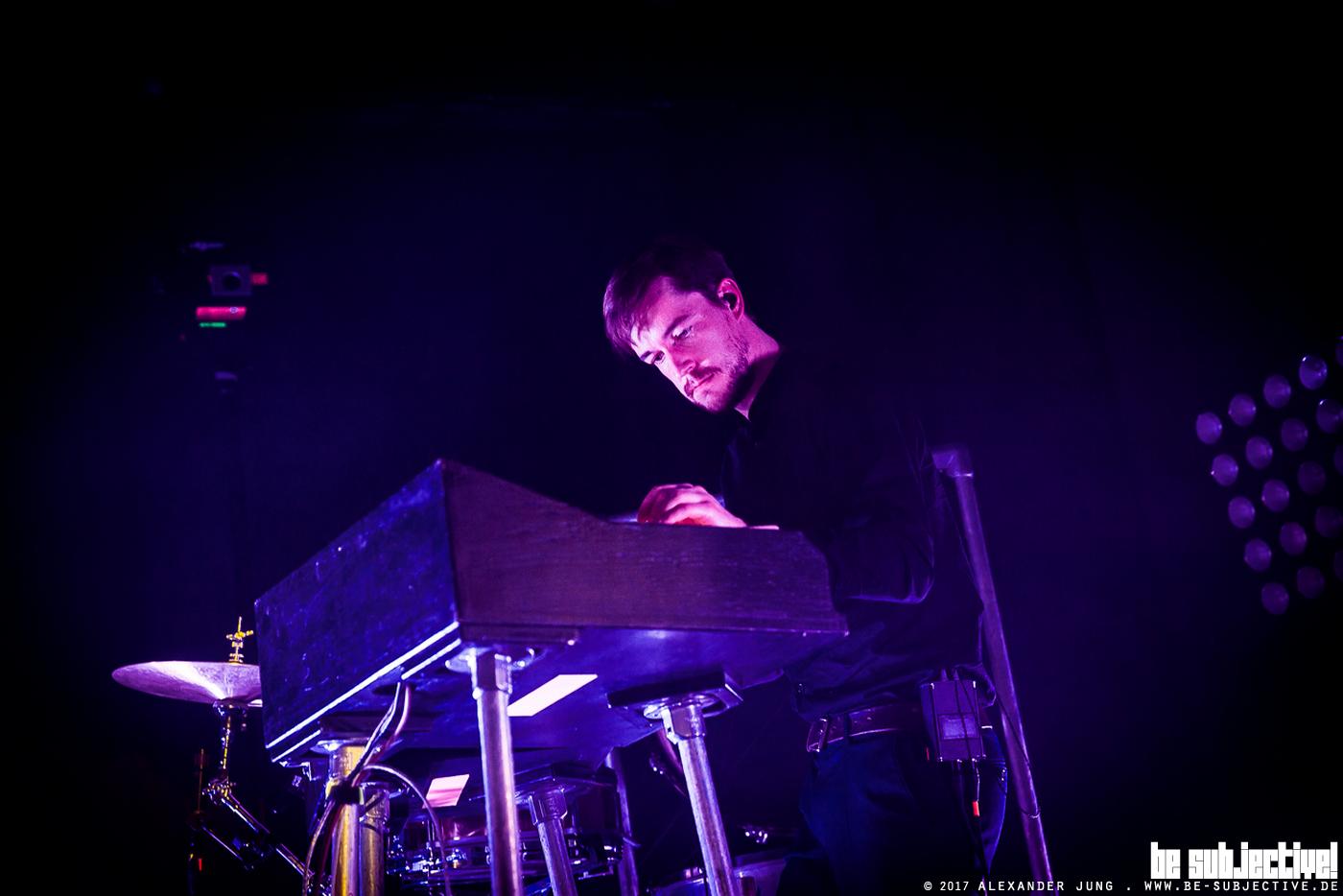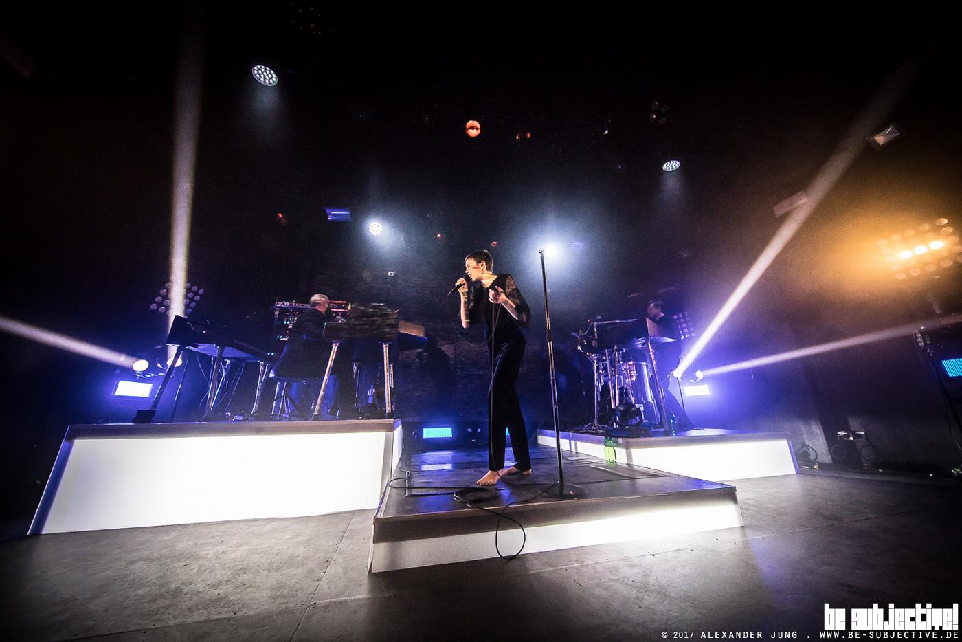 Um kurz nach 21:00 Uhr ist es dann endlich soweit – Philipp Milner und Florian Wienczny betreten die nebelverhangene Bühne zu den ersten Klängen des Titeltracks zum aktuellen Hundreds-Album „Wilderness“. Während Florian am Schlagwerk/Keys und Philipp an den Maschinen Platz nehmen, betritt Sängerin Eva Milner die schwarze Bühne, beleuchtet von gleißenden Lichtstrahlen. Zwischenzeitlich leuchten akzentuiert die Bühnenpodeste in den jeweils aktuellen Lichtfarben.