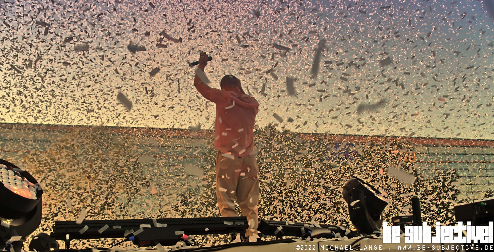 Gleich von Beginn Ihres Konzerts merkt mensch. die Herkunft der Imagine Dragons an. Daniel „Platz“ Platzman (Schlagzeug), Daniel Wayne Sermon (Gitarre), Ben McKee am Bass und Frontmann und Rampensau Dan Reynolds haben die Las Vegas-Schule durchgemacht, verinnerlicht und umgesetzt. Wo andere kleckern, wird hier geklotzt. Durch insgesamt 3 Leinwände können auch die Fans in den hinteren Reihen die Show in vollem Umfang genießen. Der Sound ist exzellent. Mit einem kurzen Einspielfilm auf der mittigen Riesenleinwand beginnt der Abend und dann „It´s Time“. Es ist Zeit. Die Multi-Platin ausgezeichneten Grammy-Gewinner wollen endlich wieder live begeistern und ihr bereits 2021 veröffentlichtes Album „Mercury – Act 1“ (Act 2 kommt am 01.07.22) live präsentieren. Mit allem was dazugehört. Gleich beim zweiten Song „Believer“ ballern die Konfettikanonen los. Wenn andere Bands 10 kg raus hauen, dann sind das hier bestimmt 50 kg. Mensch sieht nur noch weiss (ist ja auch besser als schwarz). Lange Zeit war Reynolds emotional angeschlagen, wie er selbst erzählt. Musik und eine Therapie haben ihm geholfen. Und der Mann ist topfit, körperlich und gesanglich sowieso. Er ist der Macher.