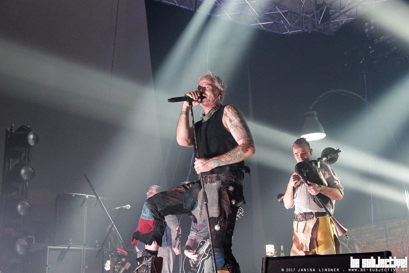 Eine halbe Stunde später sind die ersten „In Extremo“-Rufe im Publikum zu vernehmen. Mit Erfolg – kurz darauf schallt das Intro des Hauptacts durch die Halle. Wie erwartet sind In Extremo von Beginn an voll in ihrem Element. Allerdings informiert uns Sänger Michael Rhein, dass in der Band derzeit „die Seuche“ rum geht. Ihn hat es leider auch getroffen. Langjährige Fans wissen aber: