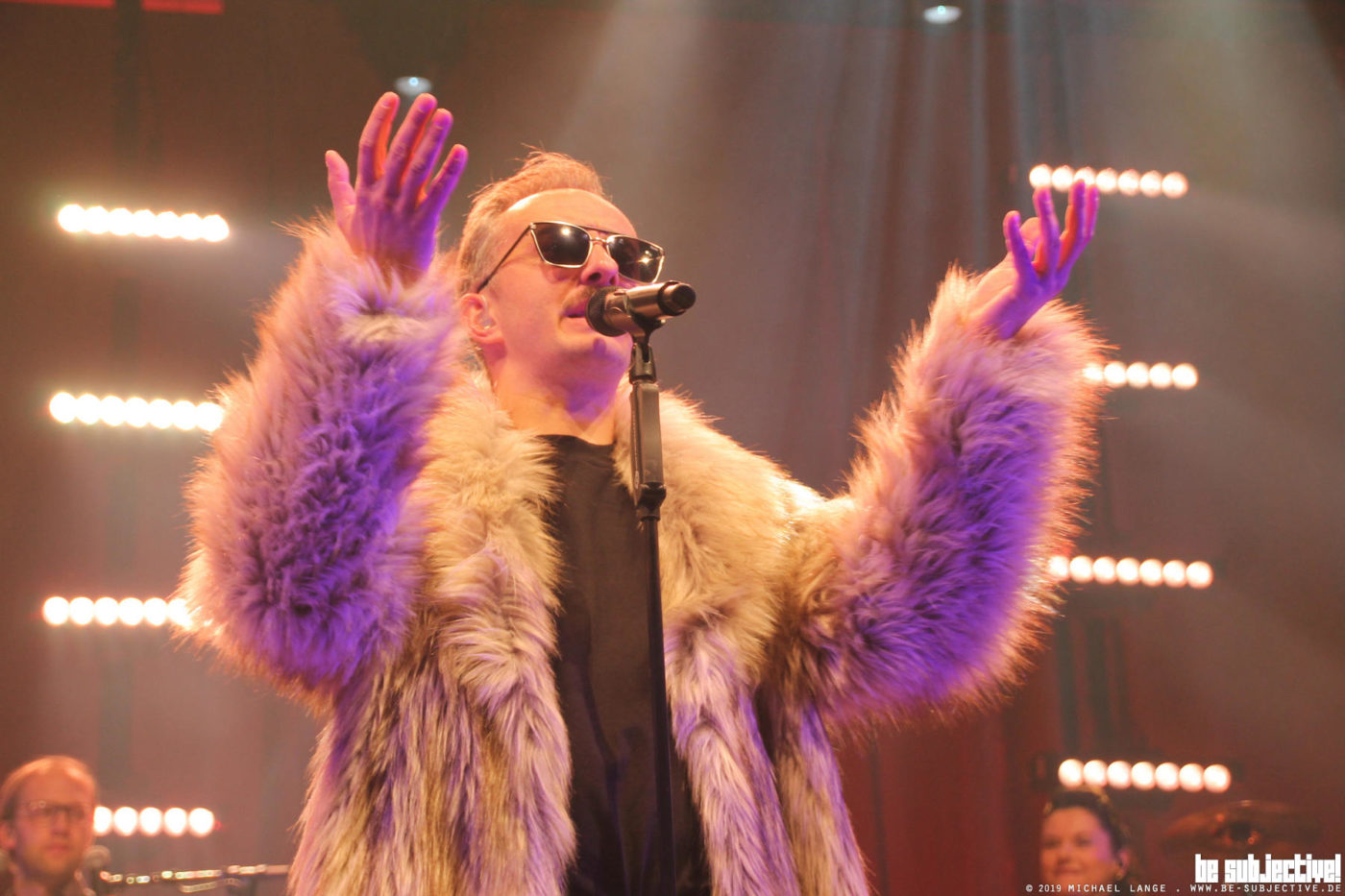 Wenn man allerdings bei Böhmermann einen eigenen Song hat, ist das eher ein Problem für den Betroffenen. „Rainer Wendt“ ist so ein Problemfall, wird dem Polizeigewerkschaftschef doch „Rechtspopulismus nachgesagt. „Sind hier irgendwelche Nazis in der Halle?“ fragt Böhmermann. Komischerweise gehen gar keine Hände hoch. Gut so. Die 3400 Fans in der Swiss Life Hall stehen auf solche Fragen. Da ist mensch doch gleich drin im Böhmermann-Universum. Mißstände aufdecken, Schmäh-Songs über Leute raushauen, die sich politisch in Deutschland lächerlich gemacht haben. Zack, bumm. Wer es noch nicht wußte: „Es gibt keine Nazis in Sachsen“. Der ZDF-Neo-Magazin-Royale-Böhmermann liefert einen politischen Liederabend in groß ab. Begleitet wird er dabei von einem großartigen 17 köpfigen Orchester. Das Rundfunk Tanz Orchester Ehrenfeld ist fast schon der heimliche Star an diesem Abend. Sie liefern Jan B die Grundlage für seine Ironie-Songs und das ganze verpackt in einem bemerkenswerten, klaren Sound.