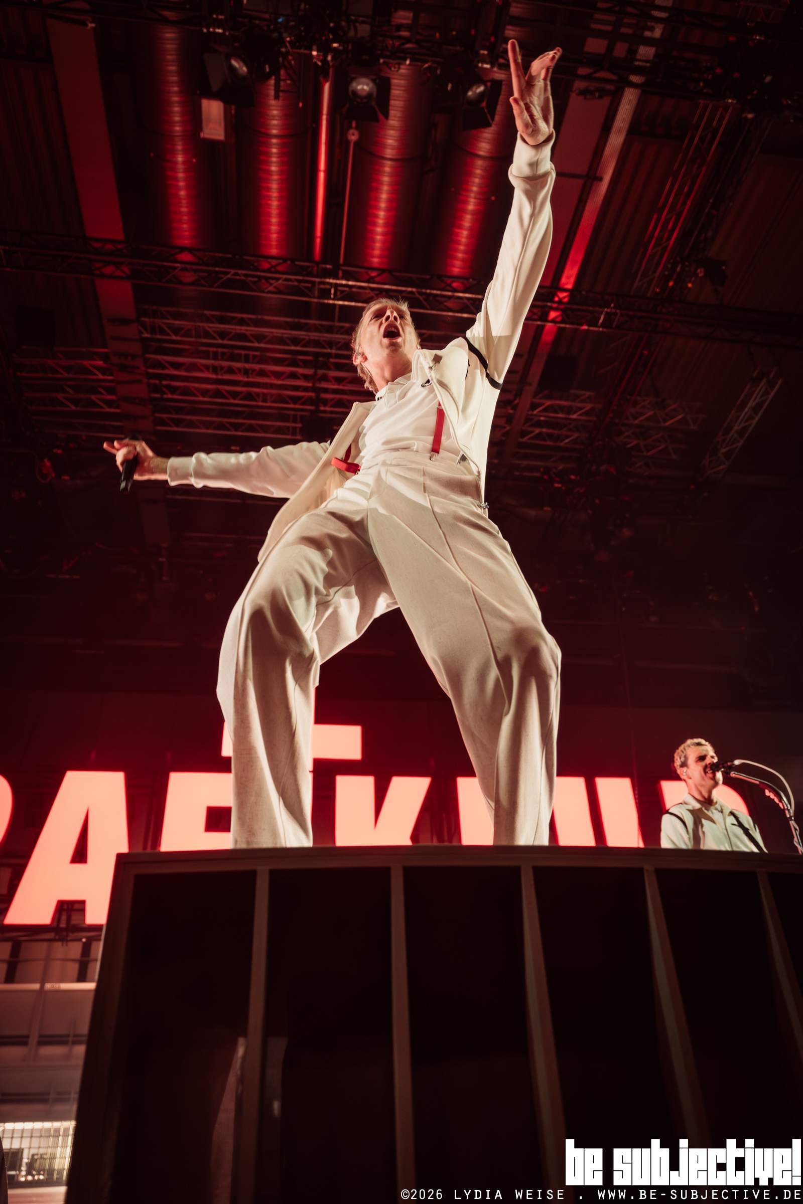 Der Abend war voller kleiner Highlights. Besonders spektakulär war der Moment, als während „Schief in jedem Chor“ ein Bengalo gezündet wurde und die Bühne in intensives rotes Licht tauchte. Oder auch als eine große Diskokugel das Licht durch die Halle schickte und der gesamte Raum plötzlich in tausenden kleinen Lichtreflexen funkelte. Ein weiterer Höhepunkt war als Felix und Till für den Song „500K“ plötzlich oben auf dem Rang auftauchten. Während der Rest der Band unten auf der Bühne spielte, performten die beiden hoch über dem Publikum. Die Halle drehte sich in diesem Moment gefühlt einmal komplett um, weil plötzlich alle versuchten zu entdecken, wo genau sie standen.