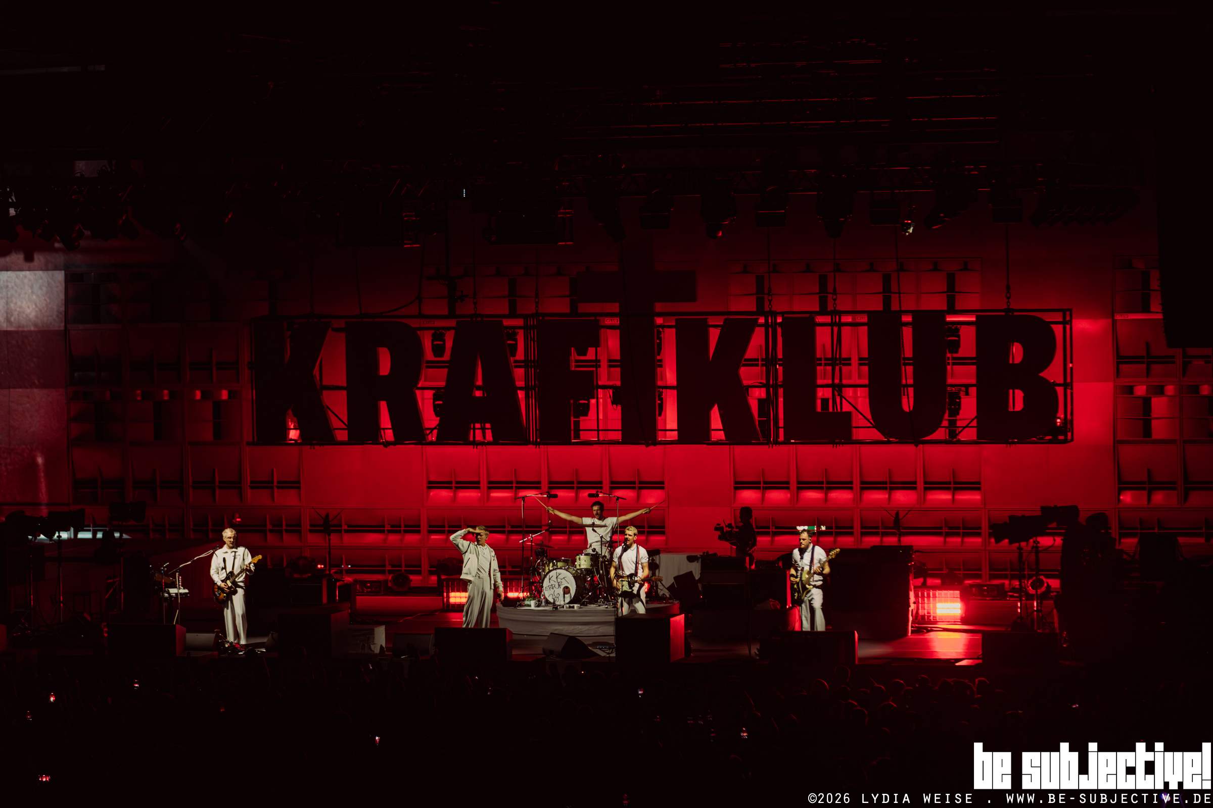 Als sich später das Licht in der Halle dimmte, wurde es schlagartig laut. Jubel verbreitete sich, während die Bühne zunächst im Dunkeln blieb. Dann tauchte ein intensives rotes Licht die Bühne in eine dramatische Atmosphäre. Nebel zog über den Bühnenboden, und im Hintergrund erschien langsam der riesige KRAFTKLUB-Schriftzug, der die Bühne dominierte.