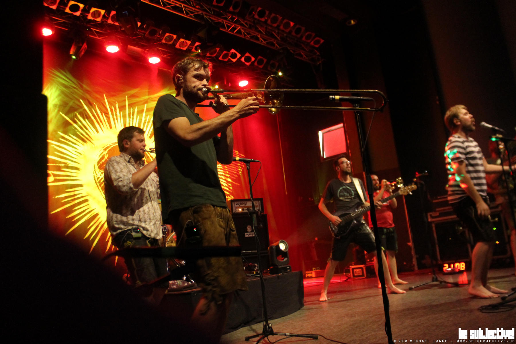 Nach dem Wickie-Intro machen LBB genau das was sie immer machen: Stimmung. Natürlich in Lederhose und barfuß. Ob im Publikum barfüßige Fans,sind, ist nicht zu erkennen, aber hin und wieder blitzt immer mal wieder Karohemd, Lederhose und Dirndl auf. Nach kurzer Zeit, also praktisch gleich nach Wickie tanzt der ganze Saal. LaBrassBanda geht nach dem Umweg über das „Bierzelt“ gleich auf die „Autobahn“ und schaltet hoch. Hier geht er Off der Beat. Immer wieder werden nette Anekdoten zum Besten gegeben. Blasmusik in Brasilien oder Vietnam, das ist schon eine ganz spezielle Nummer. Aber Musik verbindet.