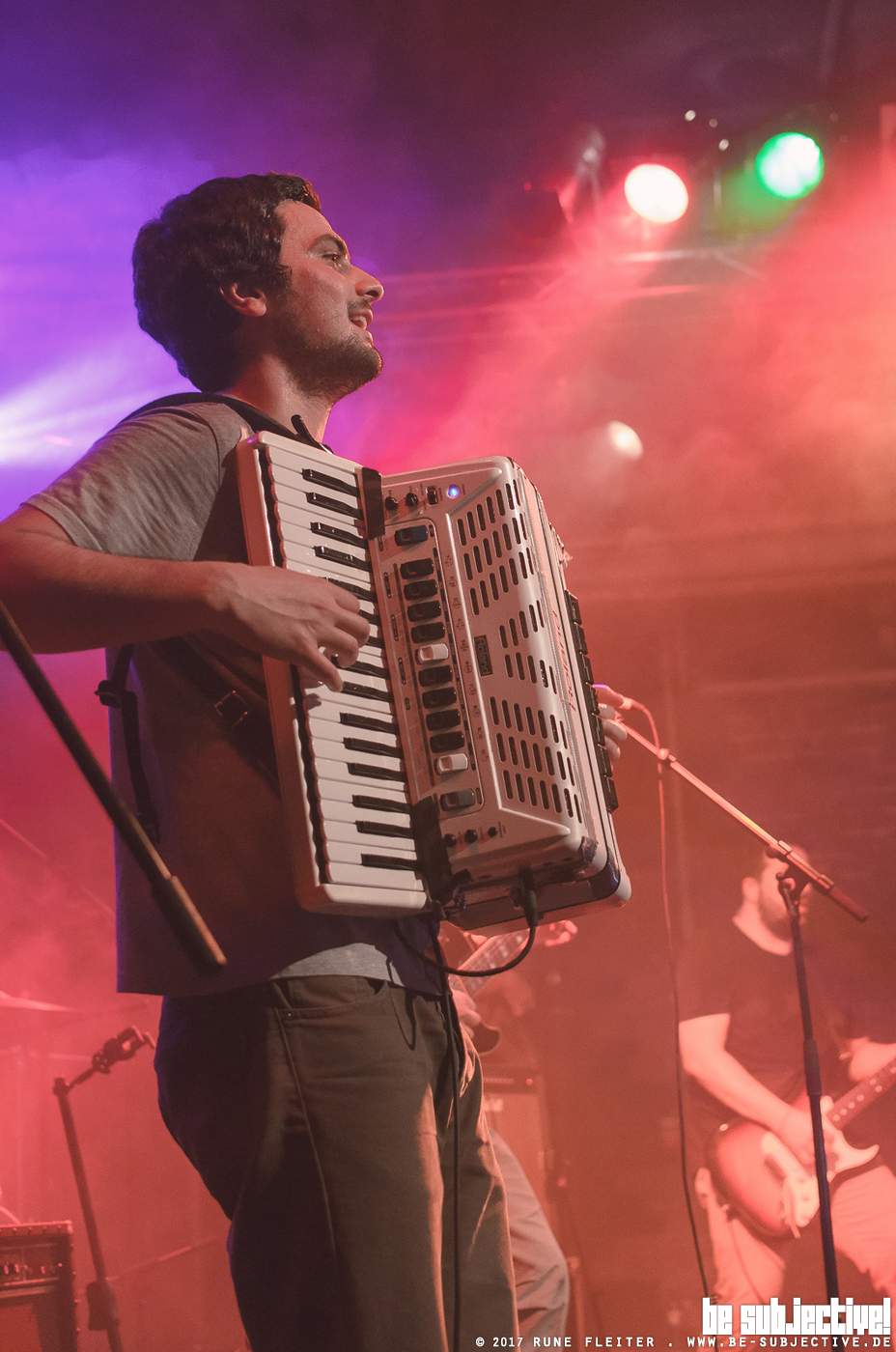 Einen Support gibt es heute nicht, scheint aber eh kaum jemanden zu interessieren. Hier warten alle auf Locomondo. Etwa 15 Minuten später als angekündigt geht es dann los. Locomondo betreten die Bühne und werden vom Publikum stürmisch empfangen. Schon jetzt ist eine ganz besondere Stimmung fühlbar, was wohl daran liegt, dass ein Großteil des Publikums der Griechischen Community angehört und nicht diese typisch ostwestfälische Zurückhaltung an den Tag legt.
