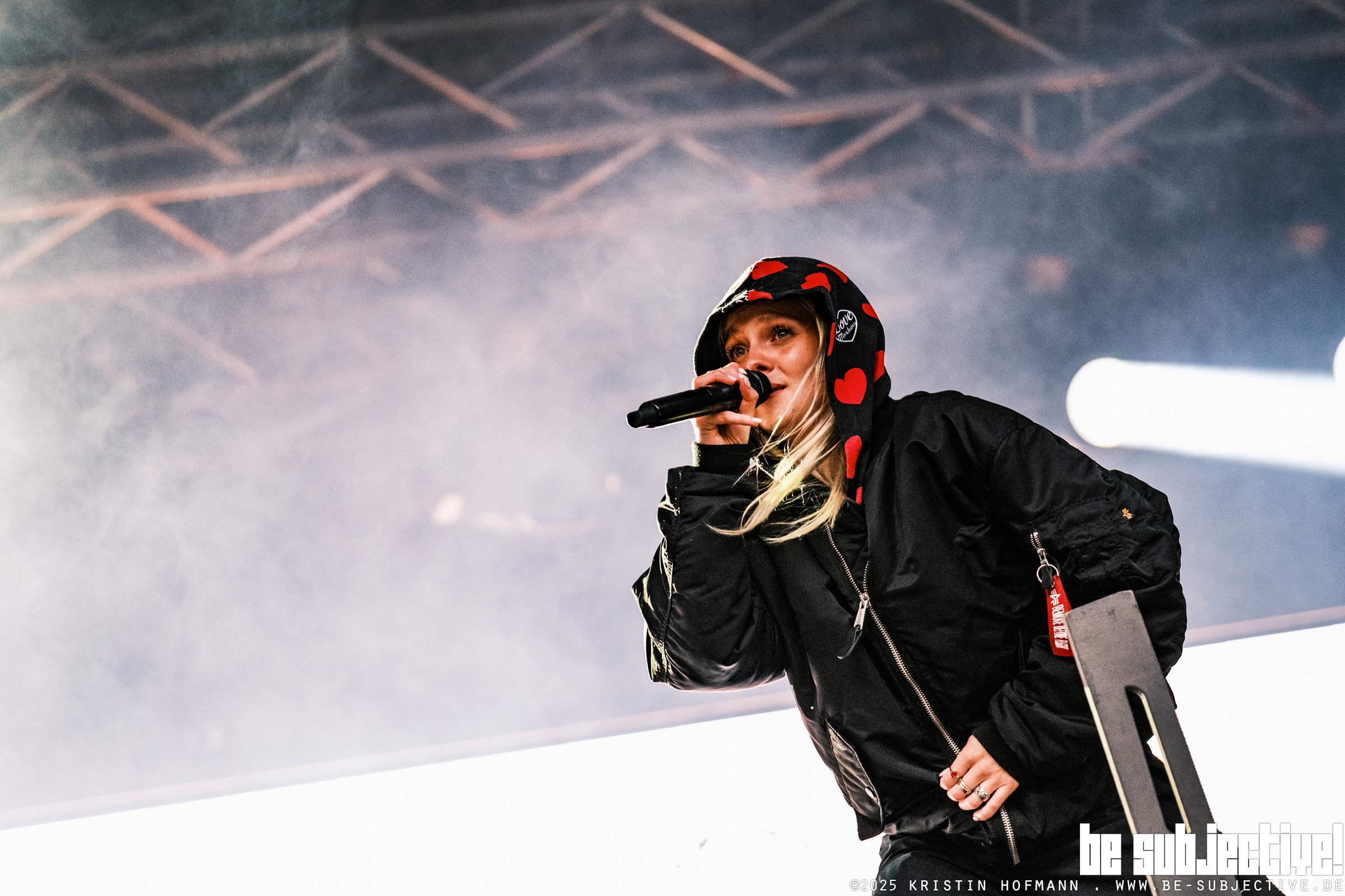 Nach einer kurzen Umbaupause wird die Bühne zur Großstadtkulisse. Hinter einer grauen Skyline verborgen, betritt Paula Hartmann mit „Kleine Feuer“ die Dächer ihrer Stadt. Versteckt im schwarzen Hoodie, umgeben von Flammen und Nebel, entfacht sie vom ersten Ton an eine Atmosphäre zwischen Großstadtromantik und Rohheit. Nach drei Songs fällt die Kulisse – die Live-Band tritt hervor, Paula ist jetzt ganz nah bei ihren Fans. Das Publikum dankt es mit lauterer Stimme und mehr Bewegung.