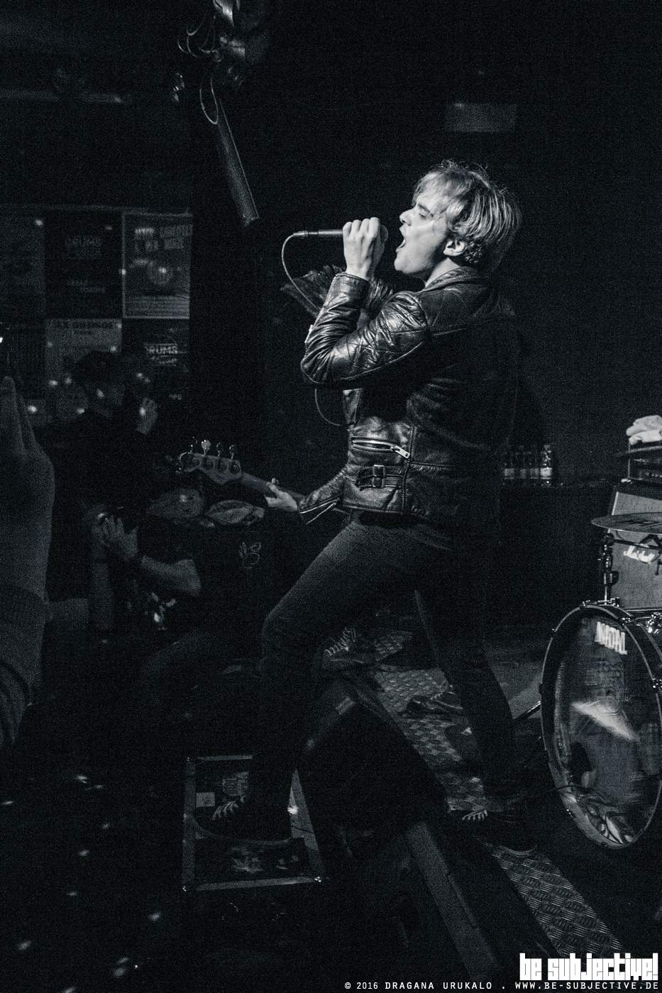 Auch, wenn die Bühnenbeleuchtung eher zweckmäßig als Stimmungsvoll ausfällt, ist die Performance der Mittzwanziger purer Wahnsinn. Mitchell Emms mischt sich mehrfach ins Publikum, nur um dort weiter Stimmung zu machen. Wenn er sich grade nicht mitten im Publikum befindet, steht er entweder auf einer der Boxen des LUX oder geht körperlich zu der Musik ab und lässt die Arme aller Anwesenden in die Luft gehen. Zum Abschluss wagt er sich noch einmal vor die Bühne und nimmt sogar den Bassisten mit, um dort das Ende des Auftrittes einzuleiten. Zurück auf der Bühne lobt die Band noch die gute Stimmung an einem Dienstagabend, freut sich darüber, hier spielen gedurft zu haben und verabschiedet sich: