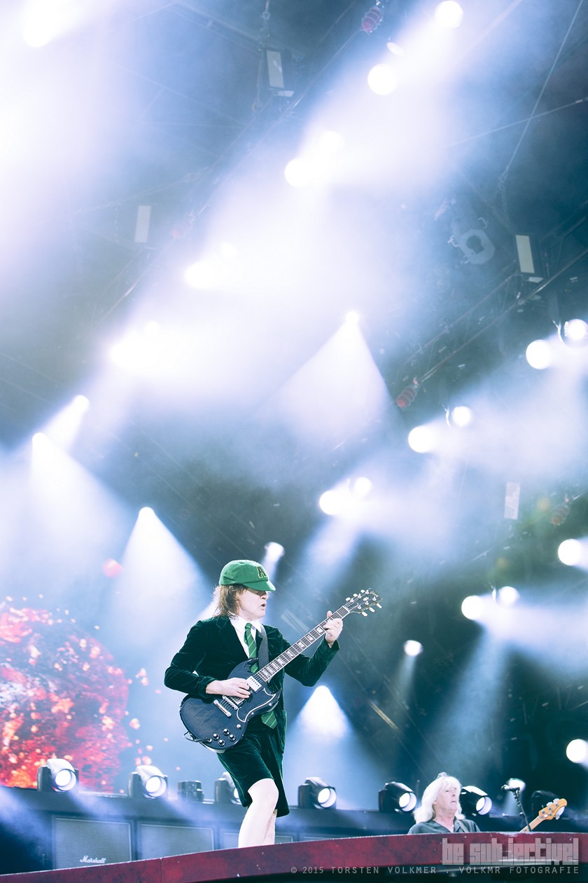 Rosie, das phallische Weib. Käuflich. Rot. Erschreckend und doch ist man(n) gebanntbreitet von der aufgestrapsten Kokotte. Ein Höllenspektakel, das Konfetti in die Menge spritzt. Und als Rosie sich zurück in ihre Laken knäult, setzt das Skandälchen zum zweiten Höhepunkt an. Angus Young wirkt wie ein kleiner Troll, der in seinem grünen Samtwams auf seiner eigenen Phantasie – einem zig Meter langen Steg ins Publikum – rockt. Wer hat, der kann. Let There Be Rock wird durch ein Gitarrensolo von Young künstlich in die Länge gezogen wie der Bühnensteg, verliert dadurch vielleicht an Dynamik, aber die Fans schmeißen Pommesgabeln in die Luft, säumen den Highway to Hell und werden mit jeder Menge Lichtshow, Feuerwerk, und Kanonen-Salut belohnt.