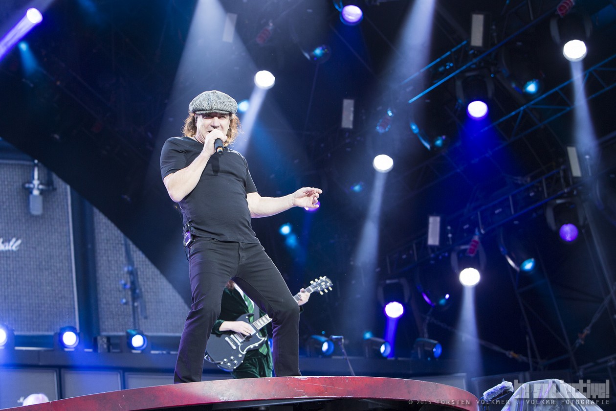 AC/DC. AC/DC. AC/DC. 20:45. Das Meer von Fan-Shirts teilt sich nicht, es spuckt einen Chor aus, der die Band aus Rosies Kammer auf die Bühne saugt. Vielstimmig überzieht Gänsehaut das Publikum, als die Leinwände mit Astronauten kegeln und sie mit viel Pyro und Kanonenfeuer phallisch in den Höllenschlund ziehen. „Rock Or Bust“ läutet ein unendliches Licht-, Bild- und Farbenspektakel ein. Die Show-Hure ist verzückt. Es scheint kaum zu stören, dass die Kommunikation mit dem Publikum eigentlich nicht stattfindet. Muss sie auch nicht, das Publikum ist hypnotisiert.