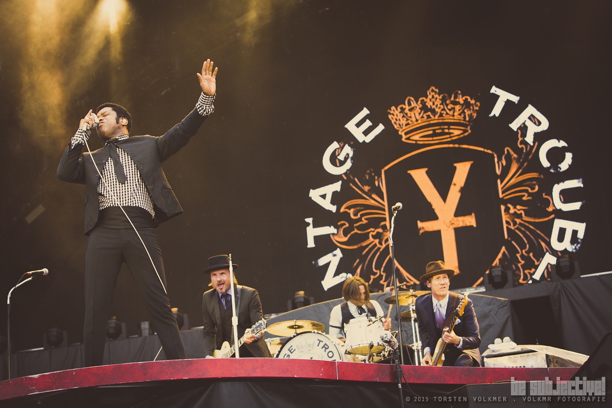 Und während Rosie im Backstage ihre sündige Wäsche anlegt, gibt es auf dem wellgeblechten Vorplatz zur Rock’n Roll Hell of Fame einen Vorgeschmack auf Sin City. Vintage Trouble nehmen die Zügellosigkeit in die Hand. Rock `n Roll Cowboys, einem Tarantino-(Nadel)Streifen entsprungen, maßgeschneidert vom Scheitel bis zur Sohle, vom Old-School-Mikrophon bis zum Kragenschmuck. Vintage Trouble entführen das Freudenhaus in die späten soul-sweaty-swinging Fifties und Sixties, in eine andere Zeit, ein anderes grandioses musikalisches Spektrum des Rock n` Roll. Detailverliebt schmiegen sich edle Dreiteiler so knapp um die Rhythm-&-Blues-Halunken, dass selbst die Sonne sich kaum mehr zurückhalten kann und endlich ihr Wolken-Dekolleté aufreißt. Otis-Redding-Sound- und Django-Unchained-Lookalike, Mr. Ty Taylor (voc), ringt dem Publikum das Versprechen ab, dass diese Nacht DIE Nacht des Rock `n Roll werde.