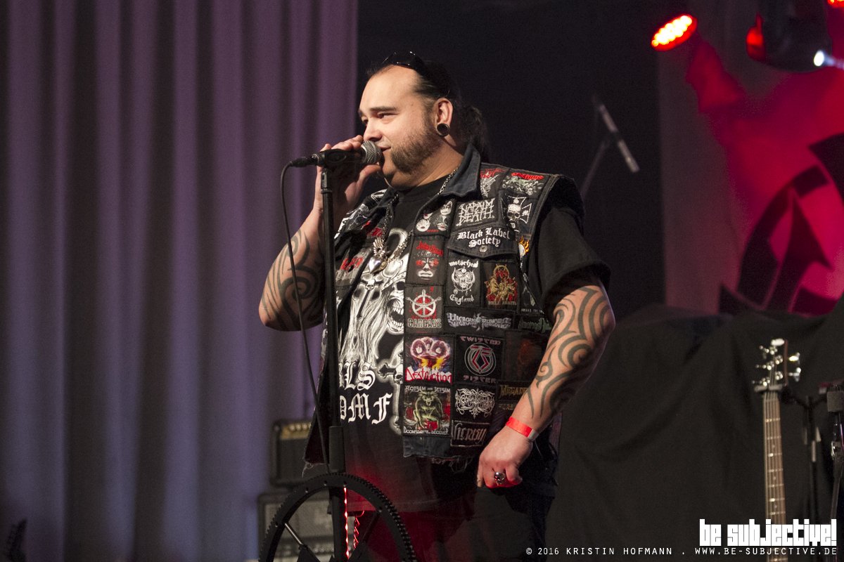 „Härte und großen Melodien! Orchestral und Episch! Down Below „Mutter Sturm“ Die Sehnsucht stürzt sich in das Meer!“ Down Below aus dem schönen Dessau-Roßlau gibt es nun auch schon 13 Jahre lang. In dieser Zeit haben die Vier jede Menge Alben veröffentlicht und sogar den dritten Platz beim Bundesvision Song Contest belegt. Heute in der Seilerei startete das Quartett auf dem zweiten Startplatz und mit einer sensationellen Lichtshow. Im Hintergrund leuchtet über dem Schlagzeug das Bandlogo. Sänger Neo Scope hat einen eigens angefertigten Mikrofonständer vor dem er sehr ausdrucksstark Musik und Texte nicht nur singt, sondern richtig lebt. Dank dem melodisch rockigen Sound bleibt hier keine Minute langweilig. Kein Wunder also, dass der Merchandise-Stand nach dem Konzert fast leer gekauft wird.