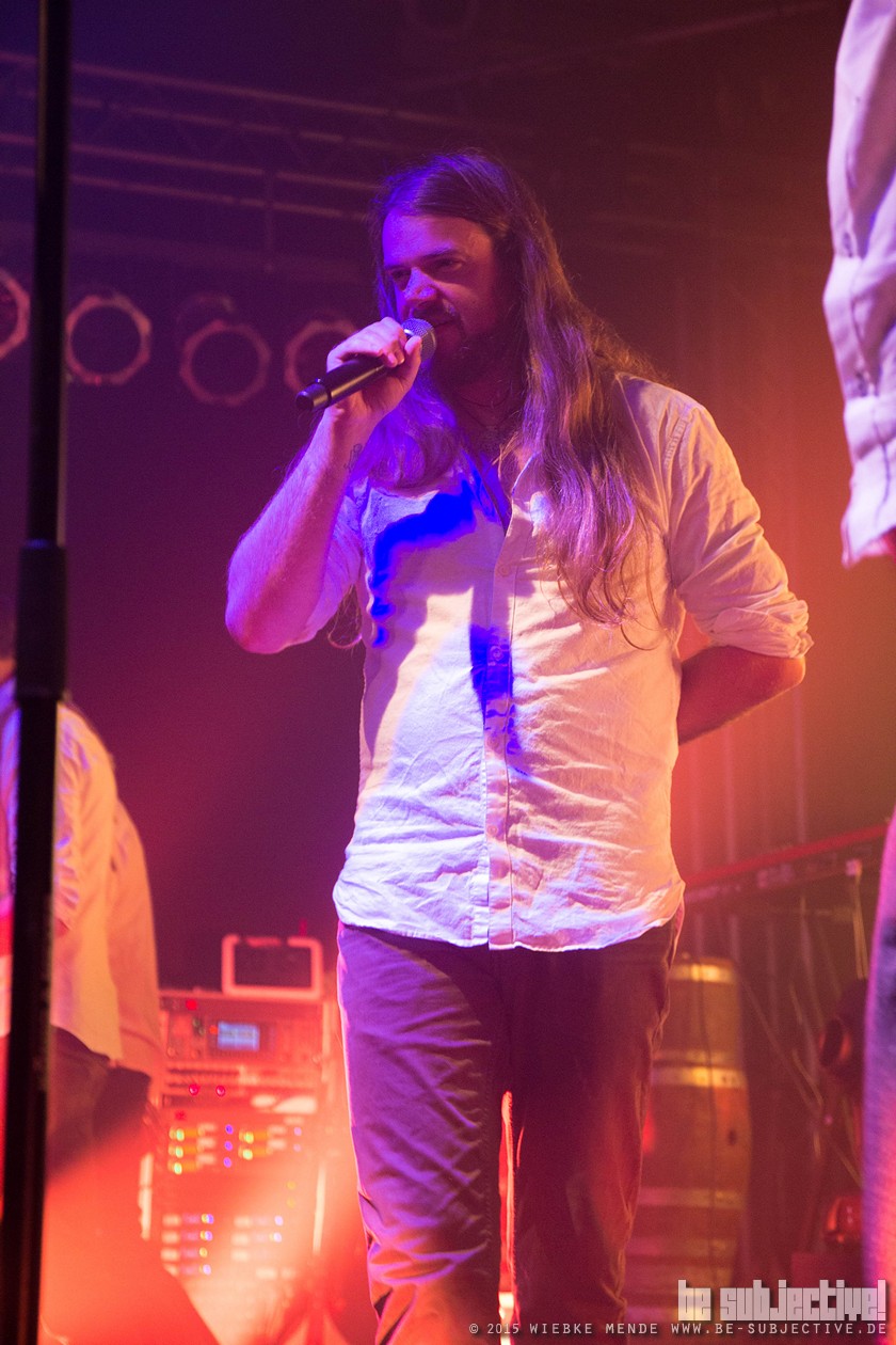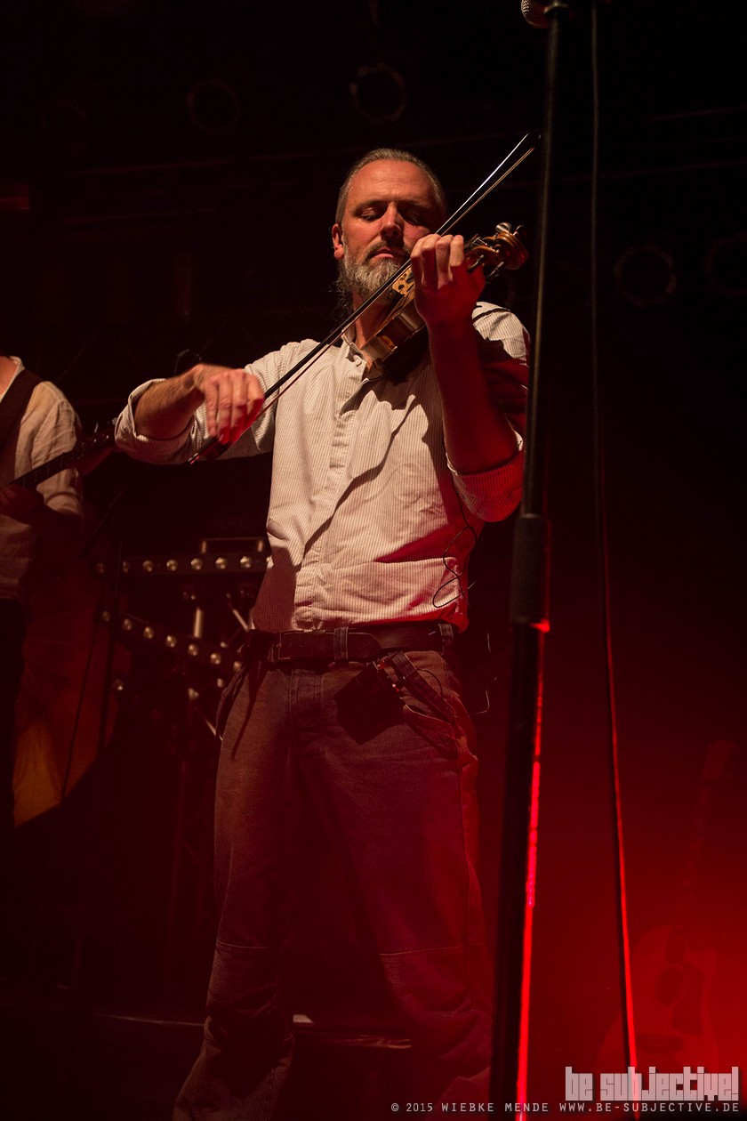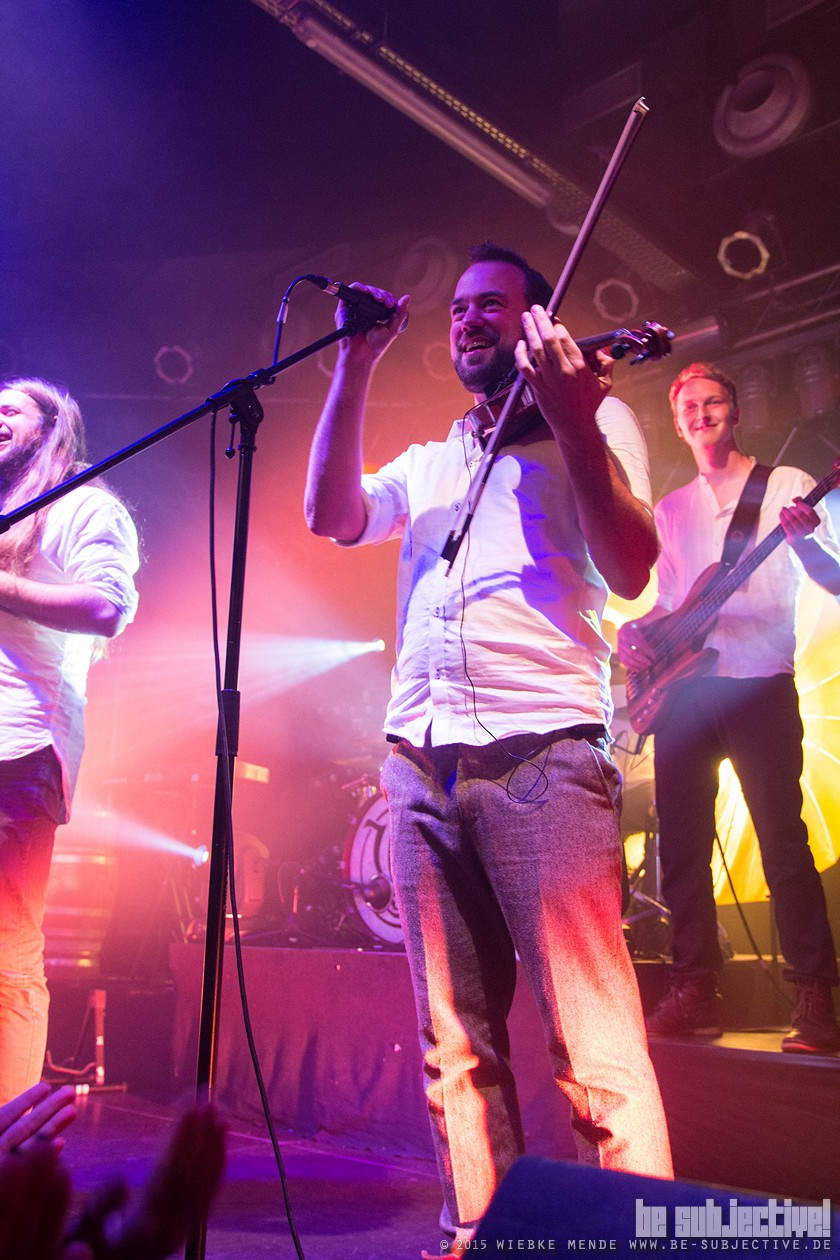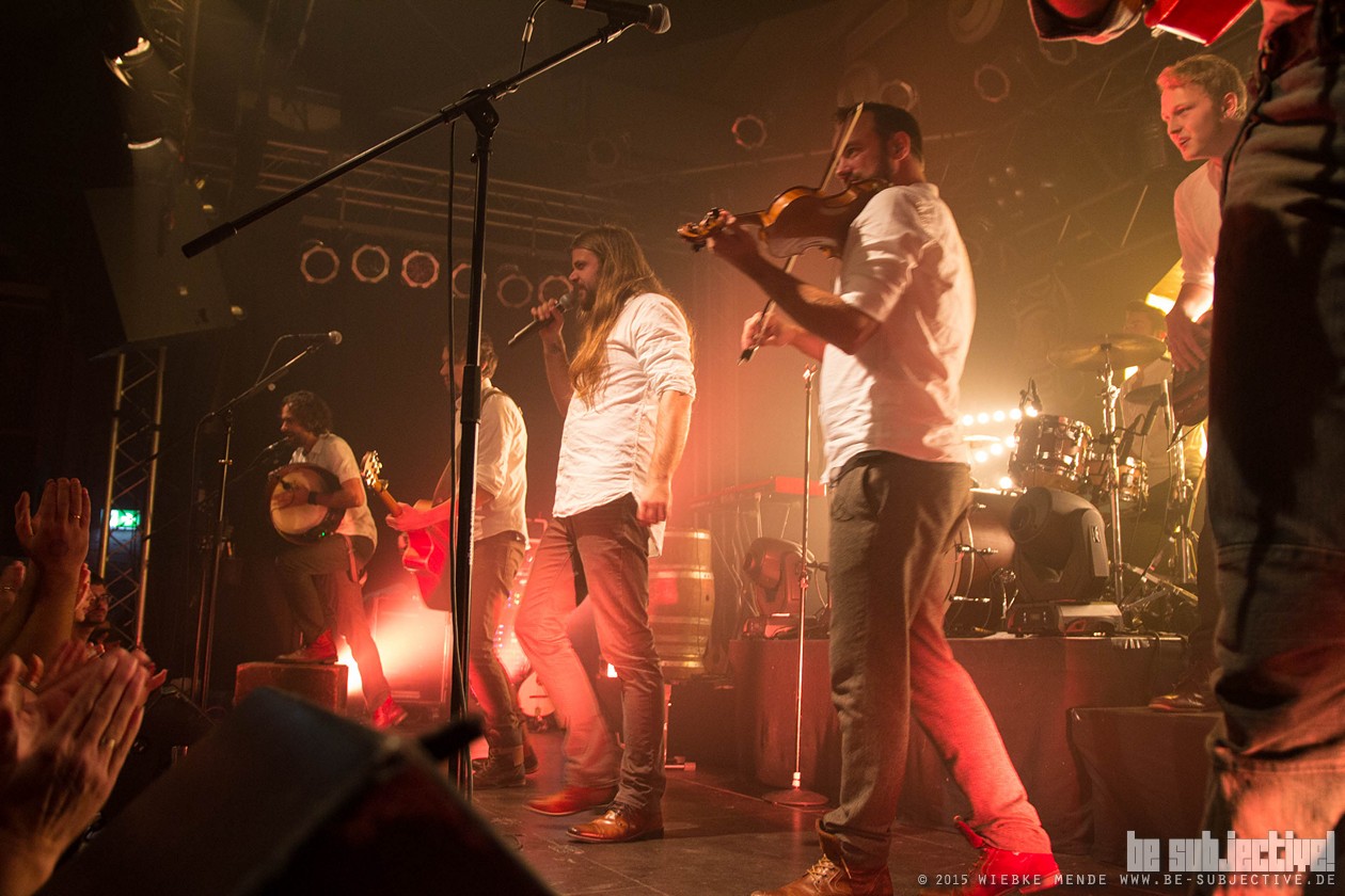 Das Publikum war außer Rand und Band. Der Veranstalter hatte die Empore im Musikzentrum freigegeben und so fanden 530 Leute Platz, die schon bei den ersten Klängen auf diesen nicht mehr zu halten waren. Beim Song „Hoch die Krüge“- eine Singleauskopplung vom Januar- sang das Publikum den Refrain komplett alleine- einfach Begeisterung pur. Spätestens beim folgenden Lied- ein instrumentaler Song- waren selbst die Skeptiker unter den Gästen überzeugt. Versengold ist eine Band, die für jeden etwas zu bieten hat. Und somit gab es ein abwechslungsreiches Programm. Neben Trink- und Tanzlieder gab es auch rein instrumentale Einlagen, ruhige Songs und Balladen. Und zu jedem Song hatte die Band eine kleine Geschichte zu erzählen. So wurde „Frühlingsgruß“ das erste Mal überhaupt live gespielt. Ein ruhiges Lied, das im Vorfeld für Diskussionen gesorgt hatte, wieso ein ganzer Song über eine Blume geschrieben wurde. Mit einem Augenzwinkern erklärte Malte, dass es nicht nur um eine Blume ginge und man doch noch einmal über den Taxt nachdenken sollte. Das Publikum lachte und grölte.