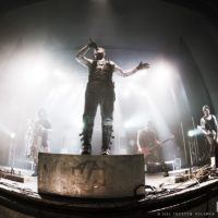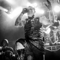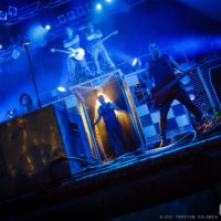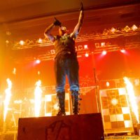 Auftritt: Das Schifferklavier, ein herrliches Steam-Punk-Kunstwerk aus Frankensteins Gruselkabinett. Stahlhelme, Leder, Testosteron, Dreck. Völkerball ziehen visuell und pyrotechnisch alle rammsteinigen Requisiten-Register. Es schlägt nicht Zwölf, doch rahmen Funken- und Nebelfontänen das lichte Spektakel. Das Fanauge is(s)t mit von der Partie, zuckt bei jeder Explosion zusammen, kalte Funken brennen sich zwinkernd in die glotzenden Netzhäute.
