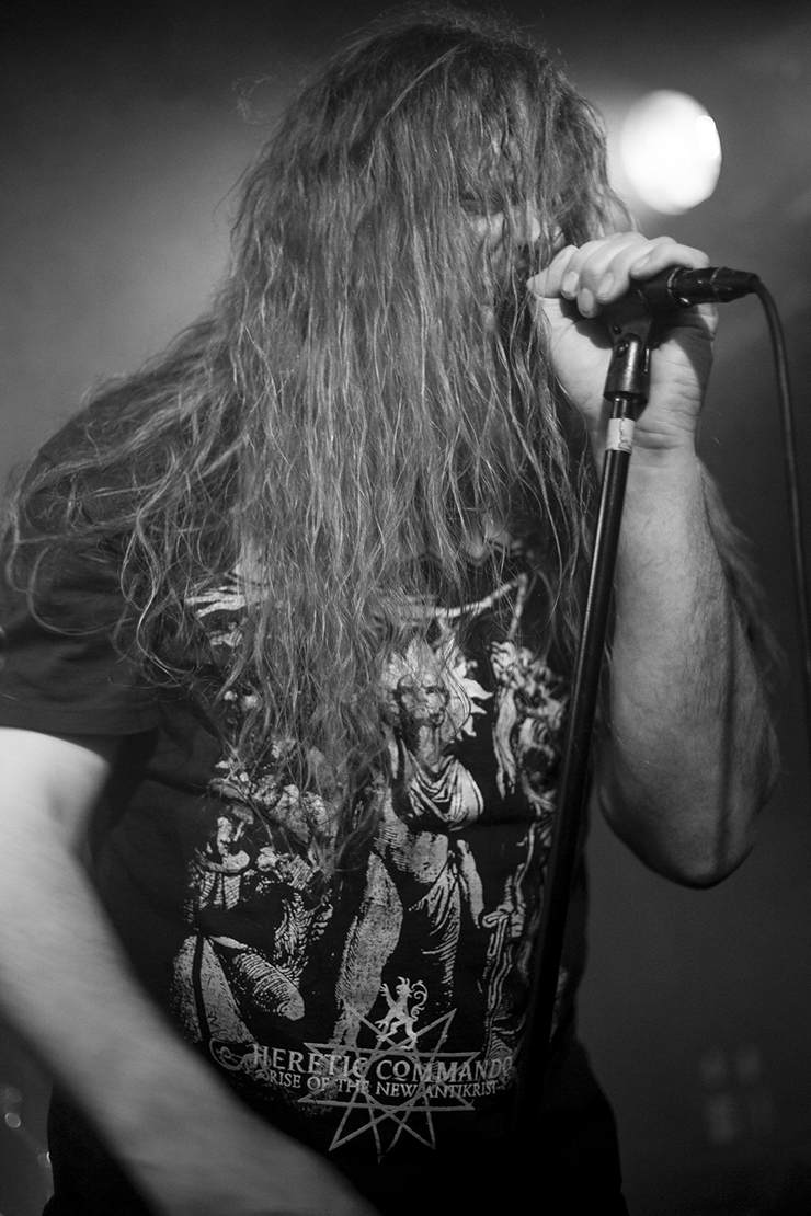 Da das Konzert 23:00 Uhr beendet sein musste, ging der Umbau mit vielen Helfern zügig voran. Gespannt warteten die Fans auf MORGOTH mit ihrem neuen Sänger Karsten „Jagger“ Jäger von DISBELIEF. Manch einer dachte sich sicher: ‚MORGOTH ohne Marc Grewe? Geht das denn?!‘ Vom ersten bis zum letzten Akkord wurde die Band bejubelt, auf und vor der Bühne flogen die mittlerweile völlig verschwitzten Matten im Takt der Klassiker und einiger neuer Stücke. Ein Mädel ließ sich mehrmals über die Köpfe des umsichtigen Publikums tragen. Doch nicht nur den Leuten vor der Bühne sondern auch den Musikern stand Freude in die Gesichter geschrieben. Mir kam es so vor, als wäre Jagger längst kein Neuling bei MORGOTH.