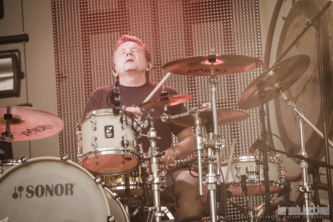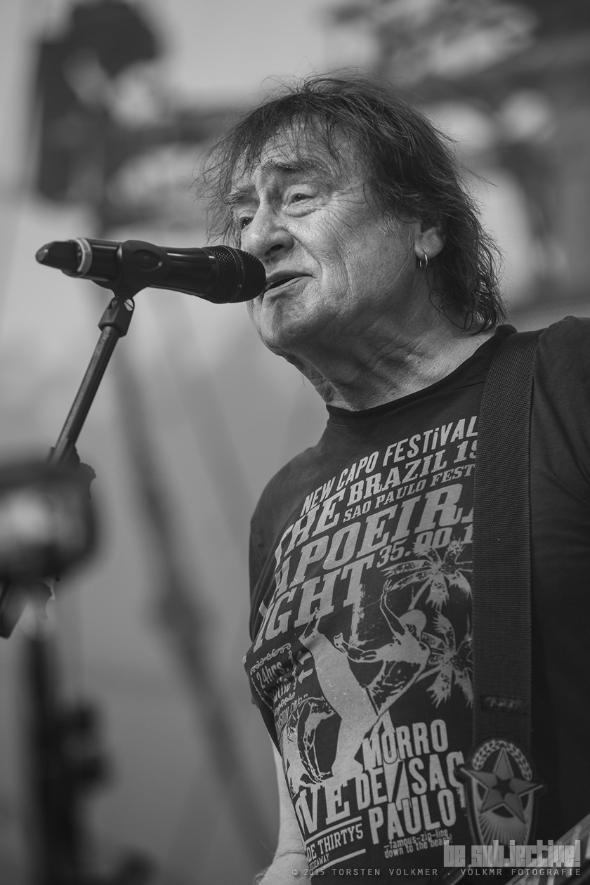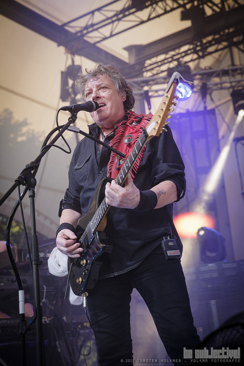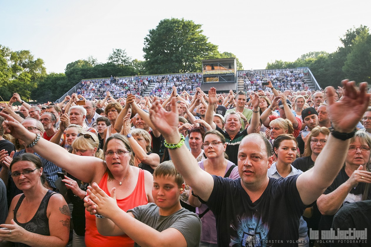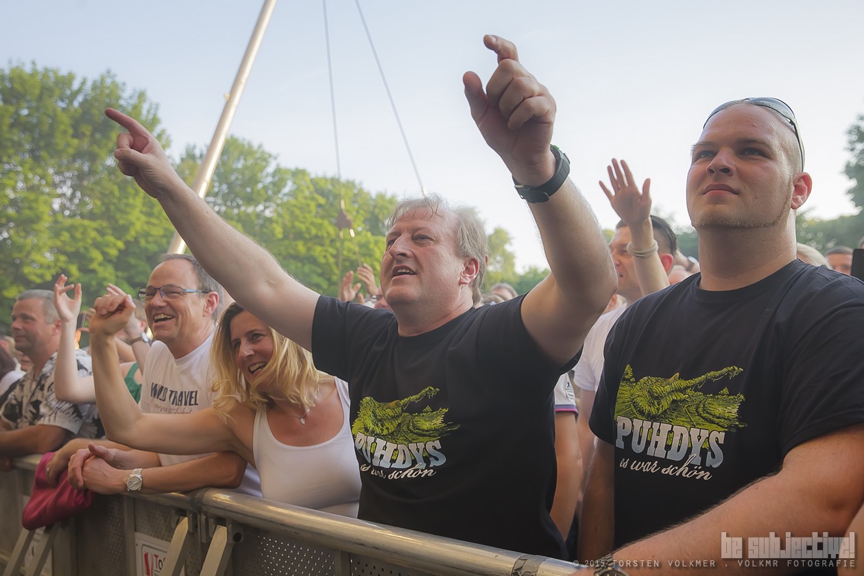 Bei 31° C im Schatten begrüßt ‚Maschine’, Dieter Birr, das Publikum. Man habe heute spontan den Saunabesuch abgesagt, um hier zu sein. Die Parkbühne strahlt bis in die letzten Reihen und wären Paul und Paula hier, ließen sie jetzt ihren Drachen steigen, Geh zu ihr und alles singt mit. Geh zu ihr. Vielleicht ist nicht jedem Urhannoveraner oder sturm- und erdverwachsenen Niedersachsen klar, dass die Puhdys nicht schnöde Ostalgie zelebrieren. Was hier zwischen Publikum und Band funkt, ist nicht nur das große „Was wäre wenn“ (alles anders gekommen wäre) des Lebens, es sind nicht die großen politischen Umbrüche, es sind unendliche Sehnsüchte, Träume, die kleinen Legenden, die unauflöslich mit den Songs der Puhdys verwachsen sind, die sich zwischen hier und dort, um damals und heute, Paul und Paula ranken. Der erste Kuss, die erste Liebe, das erste Mal .. das Herz gebrochen.