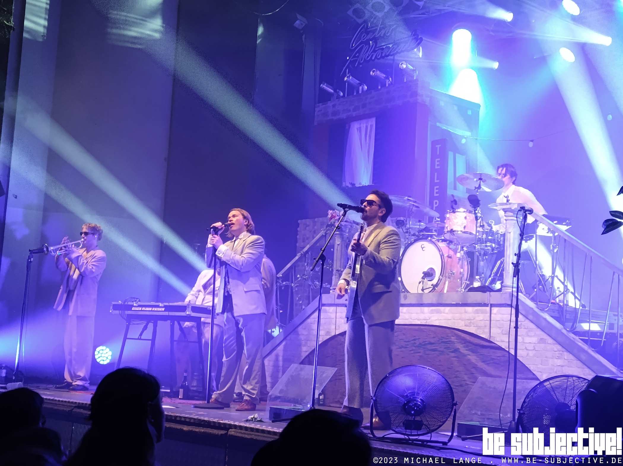 Roy Bianco und die Abbrunzati Boys haben bühnentechnisch nochmal richtig aufgerüstet. Klein Neapel mit Eisdiele, einer Bar und Hauswänden aus deren Fenstern man ins Publikum schauen kann. Das Schlagzeug steht tatsächlich auf einer venezianischen Brücke. Dann kommt ein kurzes Intro und zack, da sind sie. Sänger Roy Bianco und Gitarrist „Die Abbrunzati Boys“ plus Begleitband bestehend aus Keyboarder Ralph Rubin, Eisensepp am Bass, Schlagzeuger Bungo Jonas und Trompeter Blechkofler. Jeder steht kurz allein vorne auf der Bühne und dann geht’s gemeinsam auf die „Brennerautobahn“. Und zwar mit Dampf.