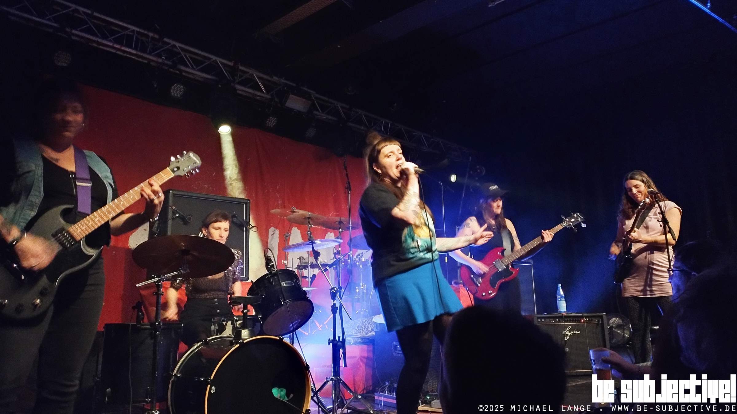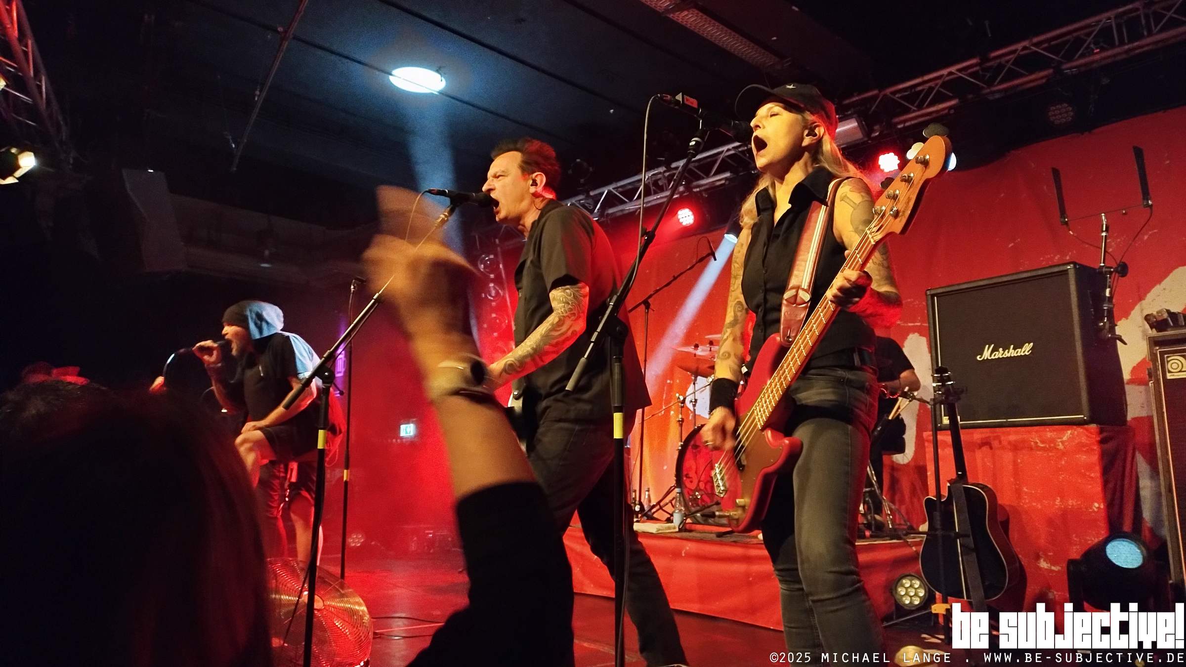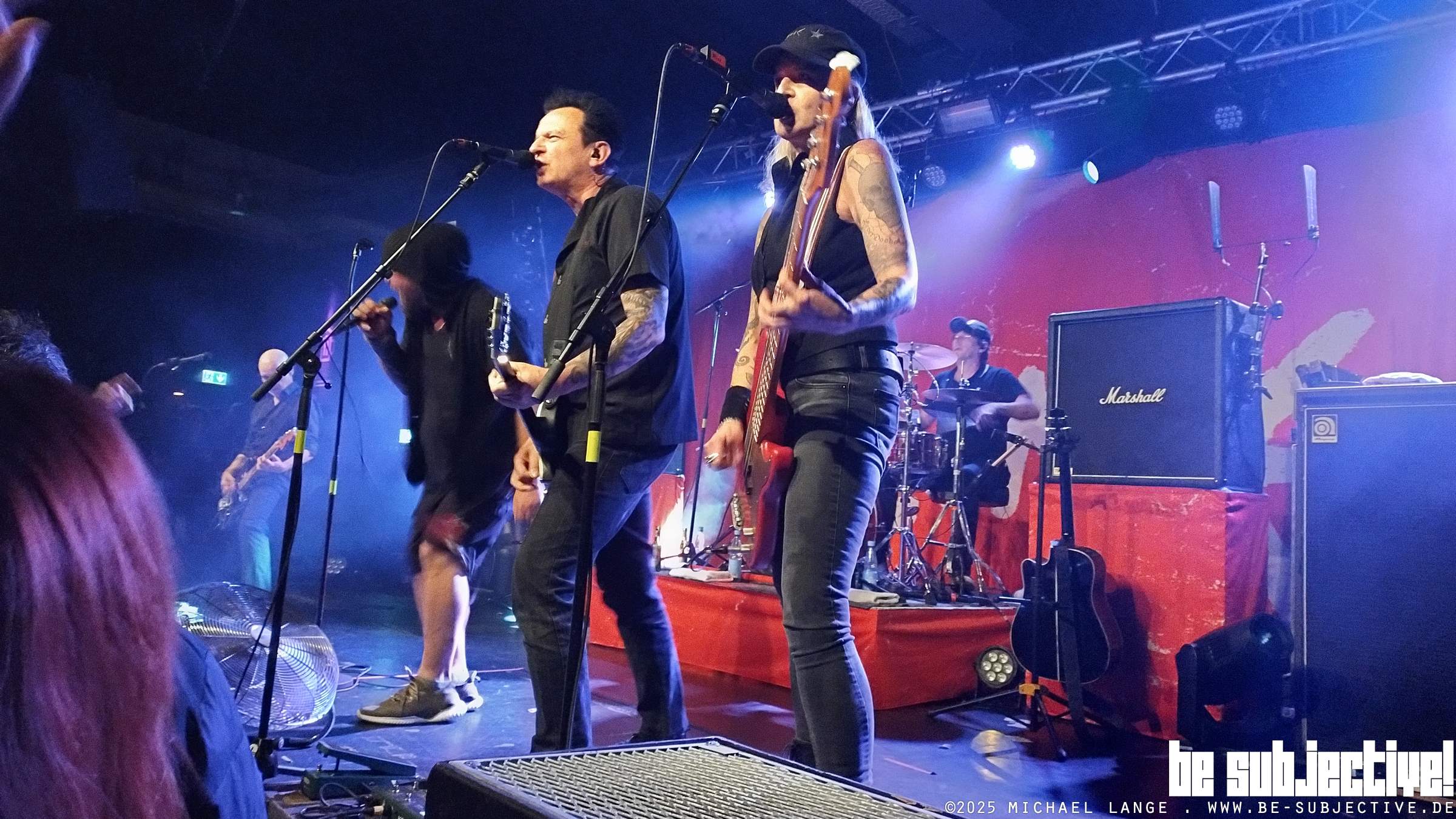 SLIME waren immer schon roh und direkt. Jeder Song trifft hier in die Magengrube oder auch tiefer. Punk ist immer Widerstand mit Haltung, intensiv und direkt . Ob zeitloser Klassiker oder neue Stücke, SLIME und ihre Fans sind immer am Anschlag. Obwohl, stimmt nicht ganz. Zwei Songs, „ Gewalt“ und „Heute nicht“ kommen akustisch daher. Mal Gelegenheit für den Sänger durchzuschnaufen. War auch nötig , denn jetzt wird in den dritten hoch geschaltet, gefühlt ist es jetzt noch lauter und wilder im Venue. Jetzt sind auch ein paar mehr Crowdsurfer unterwegs bei Hymnen wie „Sein wie die“, „Ebbe und Flut“ und „Irgendwas mit Saufen“. Ob zum Schluss irgendwas wie „Linke Spießer“ läuft oder der „Störtebecker“ kämpft, lässt sich ob der Dezibel nicht genau ausmachen. Egal. SLIME ist „Religion“ oder bunte Musik für laute Leute oder doch laute Musik für bunte Leute? Egal. Passt schon.