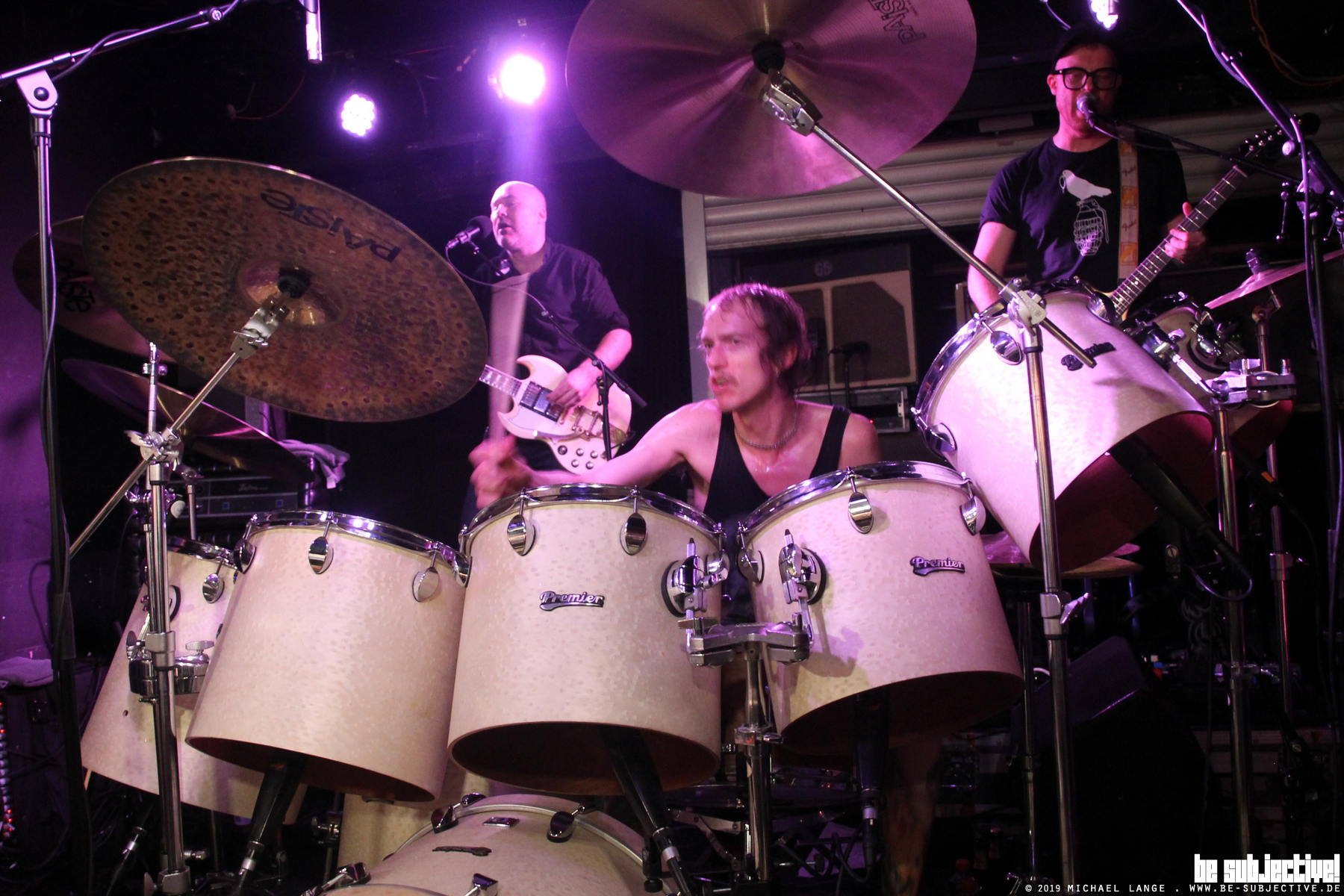Für Intros oder Soli kein Problem, aber wenn die Gitarren richtig los brettern, geht das Sax etwas unter. Auch die Platzierung der Instrumente ist bei Spidergawd ungewöhnlich. Und das liegt nicht an der Mini-Bühne im Lux Hannover. Die Gitarren stehen links und rechts in der (Achtung!) zweiten Reihe, vorne links der Bass, rechts das Sax und in der Mitte, groß und ausladend das Mega-Schlagzeug. In der Muppets-Show-Band sitzt am Schlagzeug „The Animal“. Bei Spidergawd bedient die Schießbude Kenneth Kapstad. Auch er ist ein Verrückter. Ein positiv Verrückter. Der Typ ist tatsächlich studierter Jazz-Drummer, hat in über zwanzig Bands gespielt und (fast) kein Musikgenre ausgelassen. Hammer, der Typ. Komponieren kann er auch. Nicht besonders gut am Piano, aber viel besser an seinen Drums. Für ihn ist Trommeln die schönste Tätigkeit auf der Welt. Mal intensiv, mal innig bearbeitet er seine Drums.