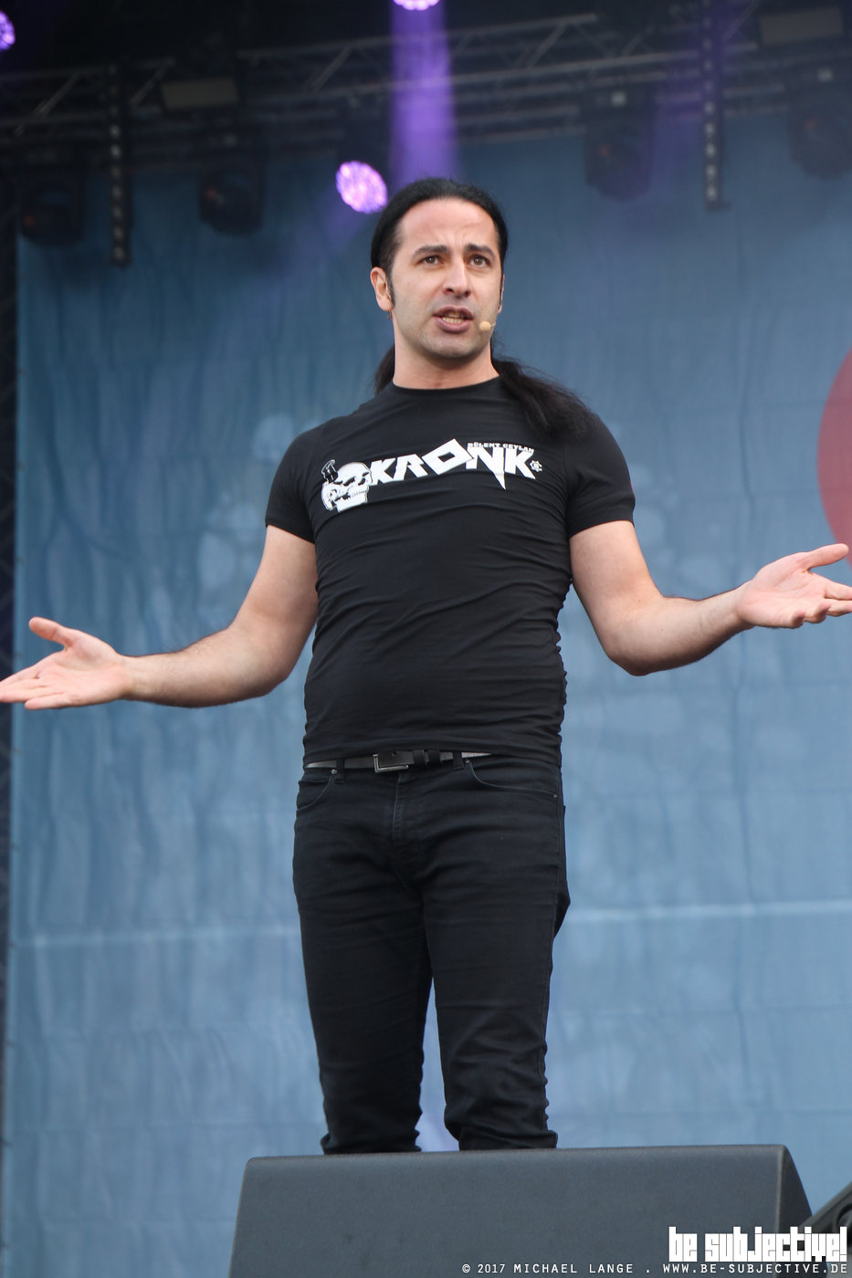 Comedy, Zauberei und natürlich Musik, Musik, Musik. Jeder der 10 Künstler bekommt 20-30 Minuten Auftrittszeit. Nicht viel, aber trotzdem genug, um sich in die Herzen der 17.500 Fans auf der Expo-Plaza zu spielen und seine Visitenkarte abzugeben. Der erste Künstler sorgt gleich für gute Stimmung. Bülent Ceylan ist „Kronk“. Er hat ein Gespür für Situationen, die er analysiert und dann mit seinen Kunstfiguren aufarbeitet. Direkt, klar und auf den Punkt bringend haut der Mannheimer Türk die Gags raus. Das beste Heilmittel der Welt ist halt immer noch herzhaftes Lachen und natürlich Headbanging mit Hassan. Das ist doch mal ein sehr gelungener Start in einen Konzertnachmittag.