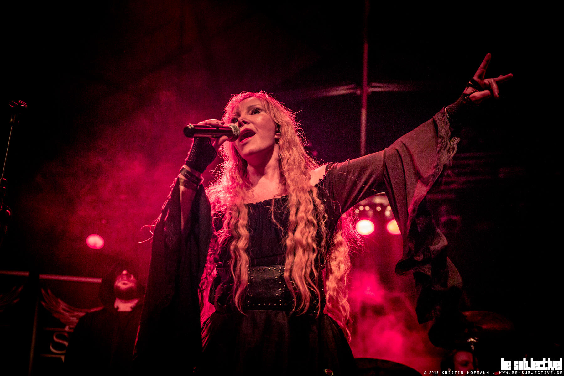 Doch bevor die nordskandinavische Symphonie beginnt haben Serpentyne noch vor offiziellem Beginn von 19.45 Uhr den Konzertabend schon eröffnet. Die Band aus London spielt Symphonic Rock mit hörbaren Folk-Einflüssen. In der schon gut gefüllten Reithalle stellen Serpentyne mit einigen Songs ihre Debüt-LP „The Serpent‘s Kiss“ vor. Von denen kann mich an ehesten der Letzte „Morrighan‘s Jig“ überzeugen. Aber nicht weil er an letzter Stelle kommt und dies bedeutet, daß das Set der Vorband vorbei ist, sondern durchaus musikalisch. Zuvor bedankt sich Sängerin Maggiebeth Sand noch ganz besonders bei einigen Menschen im vorderen Bereich des Publikums, da sie die Band in den letzten Wochen anscheinend sehr unterstützt haben. Die Tour „A Nordic Symphony ‘18“ ist bereits schon eine Weile im Gange und Dresden ist auch der letzte Termin in Deutschland.