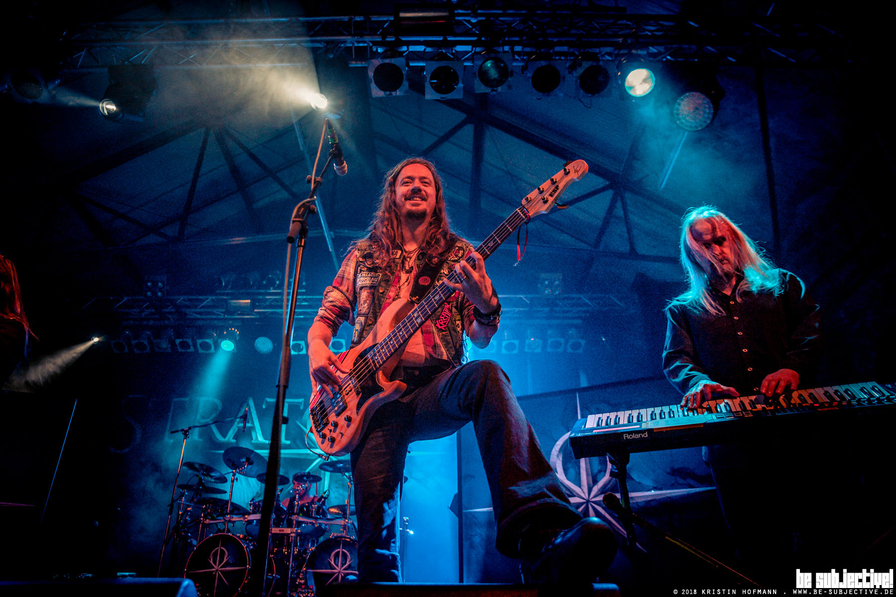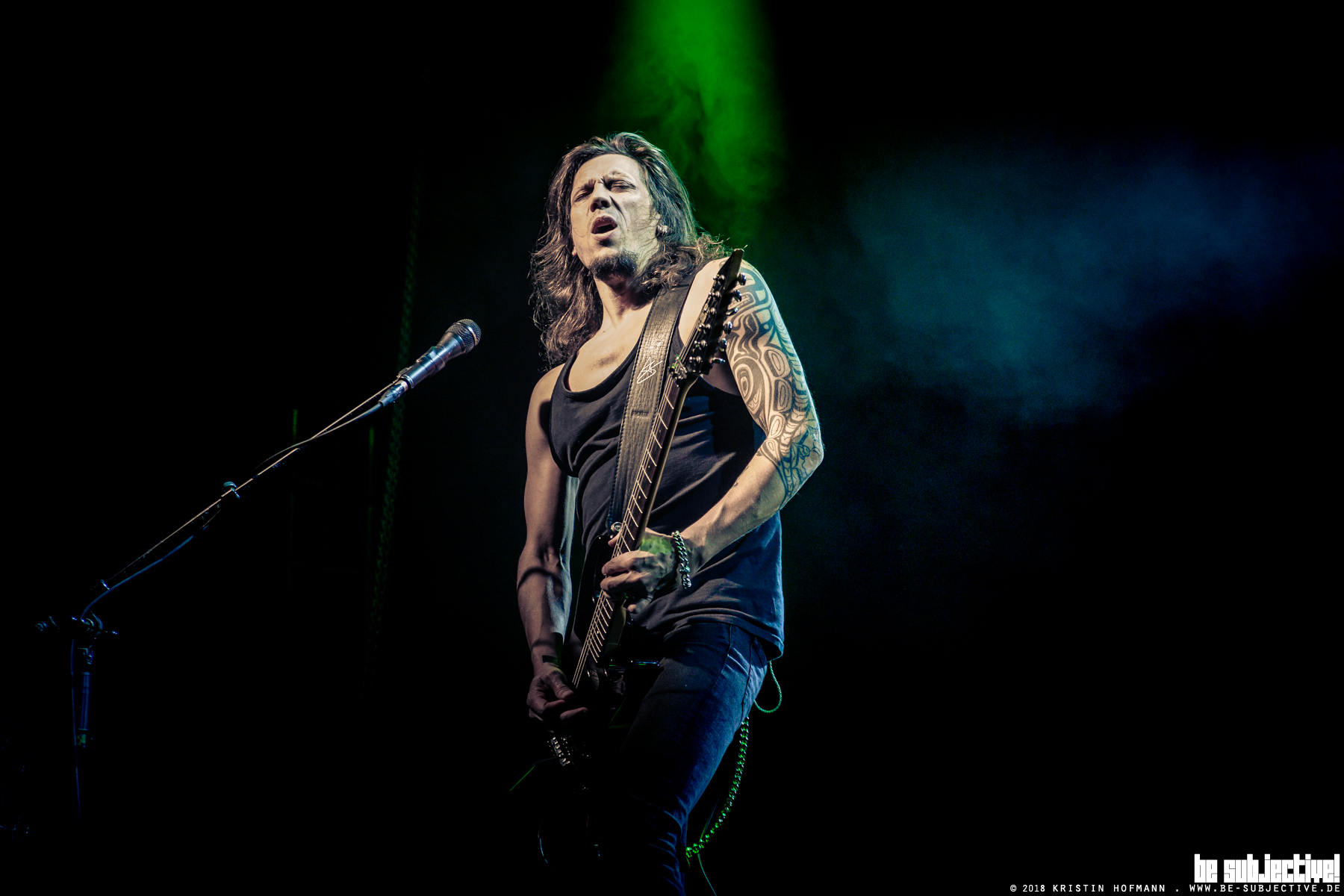 Nach einer kurzen Umbaupause wird es nun also Zeit für die erste Hauptband. Stratovarius aus Finnland gibt es schon seit über dreißig Jahren, aber bis auf den Namen ist diese Band bis jetzt an mir vorbeigegangen. Was daran liegt, daß ich ganz allgemein weder viel mit Symphonic – mit wenigen Ausnahmen – bzw. Power Metal anfangen kann. Aber ich lass mich gerne vom Gegenteil überzeugen und habe mir vor ihrem heutigen Auftritt extra auch nichts von Stratovarius angehört und bin somit ganz unvoreingenommen. Die Finnen um Sänger Timo Kotipelto werden jedenfalls vom Publikum in Dresden begeistert empfangen und eröffnen ihr Set mit Eagleheart“ von ihrem mit erfolgreichsten Album „Elements Pt.1“. Aber schon danach wusste ich, Stratovarius und mein Gehör sind bzw. werden nicht kompatibel. Viele Menschen in der Reithalle sehen das anderes und besonders im vorderen Bereich wird laut mitgejubelt. Wie gesagt, dass ist meine ganz persönliche Meinung. Wenn die Stimme des Sängers nicht passt ist das die eine Sache, aber auch die Performance kann mich nicht wirklich überzeugen. Die Finnen sind Power Metaller der ersten Stunde, von Power ist auf der Bühne leider nicht viel zu sehen und das Ganze wirkt auf mich, als hätten die Herren ihre besten Jahre schon hinter sich. Deshalb suche ich mir ein stilles Plätzchen im hinteren Teil der Reithalle und bin ganz froh als die Finnen ihre letzten beiden Songs ankündigen. Während die Meisten im Publikum Stratovarius bei „Unbreakable“ und „Hunting High And Low“ nochmal ordentlich feiern.
