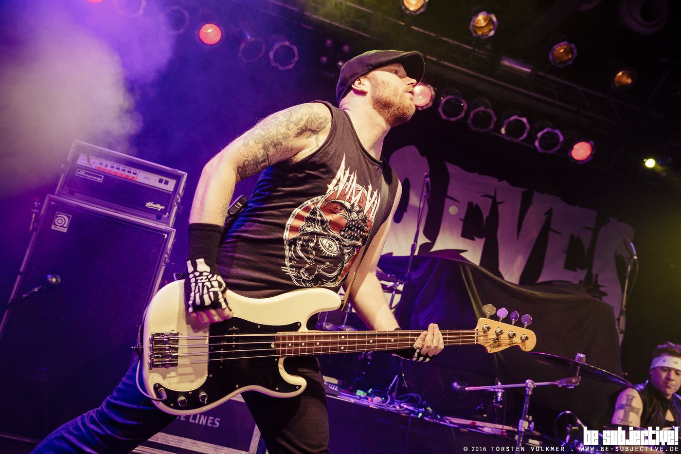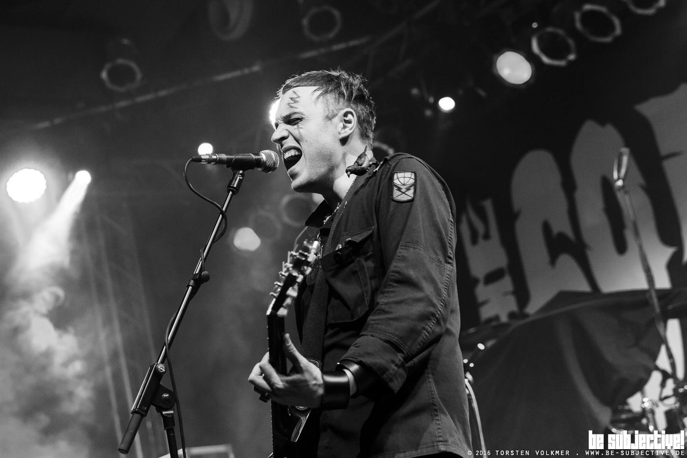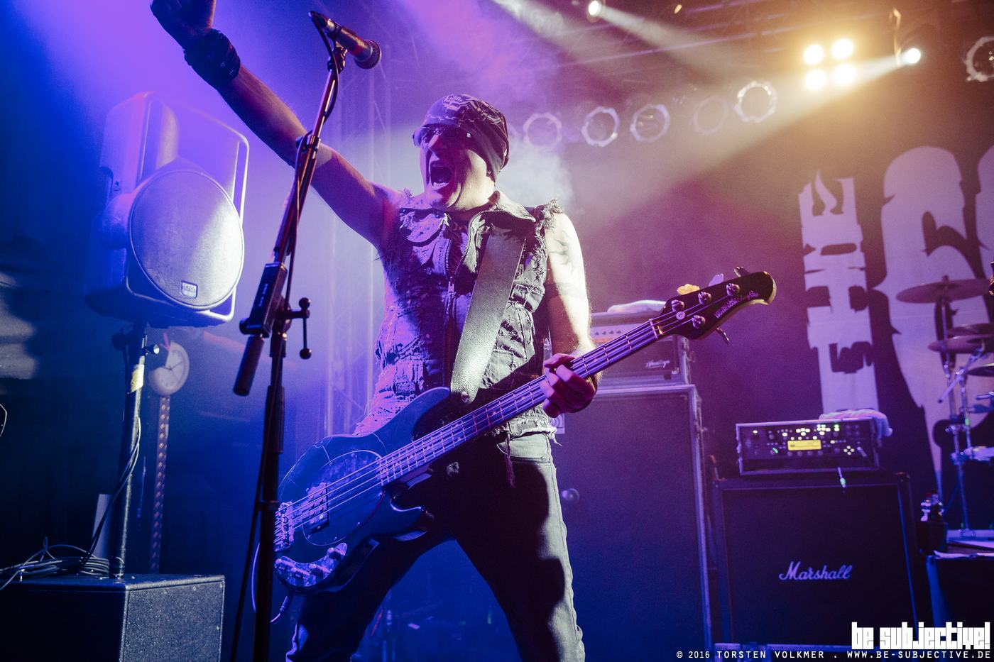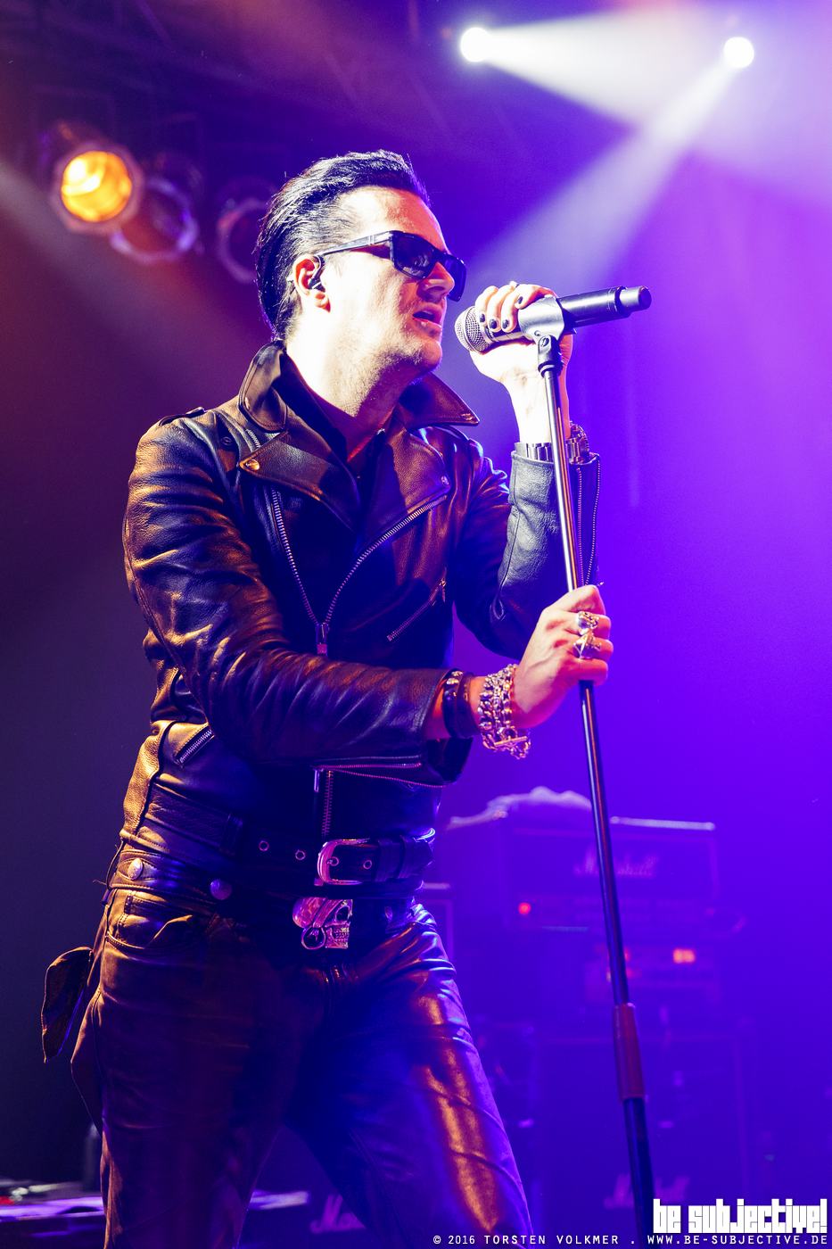 Erst bei Jerusalem, einer der auserwählten fünf Songs vom neuen Album „Universal Monsters“, wagt sich der Frontvampir die Sonnenbrille abzunehmen und seine mit schwarzem Kajal verschmierten Augen dem brennenden Scheinwerferlicht auszusetzen. Nicht nur die Augen leiden unter den Scheinwerfern, sondern auch die Schweißdrüsen. Bei so viel Bewegung in dickem Bühnenoutfit darf auf der Bühne Schweiß en masse nicht fehlen. Und was wäre außerdem ein Konzertabend in Hannover, wenn nicht der altbekannte „Hangover-Witz“ zu Wort kommt?