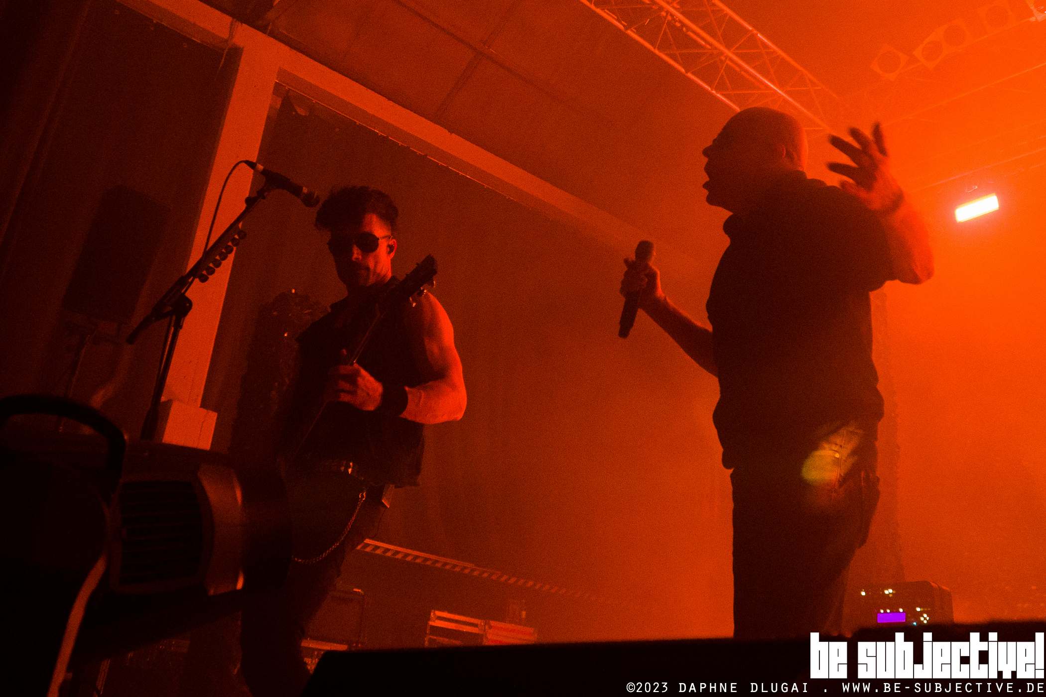 Um kurz vor neun geht es dann los, das Licht wird gedimmt und die Bühne noch mal ordentlich eingenebelt. Es folgt ein gefühlt nicht enden wollendes Intro. Auf kurze Unsicherheit ob dieses „Intro“ wirklich ein Intro ist folgt die Gewissheit als kurze Zeit später um viertel nach neun The Sisters of Mercy endlich die in nun dichten Nebel gehüllte Bühne betreten. Das einfarbige Licht, in welches die Bühne getaucht ist, trägt nicht gerade dazu bei ein auch nur ansatzweise ansprechendes Bühnenbild zu gestalten. Bis auf die Farbe ändert sich an diesem Lichtkonzept auch über den Abend hinweg nichts weiter. Mehr als schemenhaft sind die Musiker so nur selten zu erkennen. Nicht nur visuell wird hier so eine Distanz zum Publikum erzeugt, auch die Band selbst um Frontmann Andrew Eldritch gibt sich sehr distanziert, Interaktion mit dem Publikum findet so gut wie gar nicht statt. Gitarrist Ben Christo der immer wieder zwischen seinen beiden Mikrofonen die jeweils links und rechts auf der Bühne stehen hin und her wandert gibt sich ebenfalls recht unnahbar, sein poserhaftes hinknien an der Bühnenkannte trägt auch nicht zum Gegenteil bei. Was die ersten ein bis zwei Male noch ganz cool lässig wirkt verliert mit jedem weiteren Mal den gewünschten Effekt. The Sisters of Mercy spulen ihr Programm stur runter, Ansagen zwischen den Songs sind ebenfalls Mangelwahre.